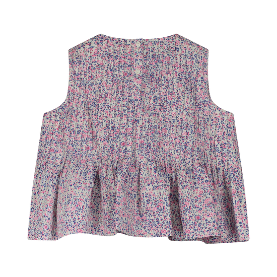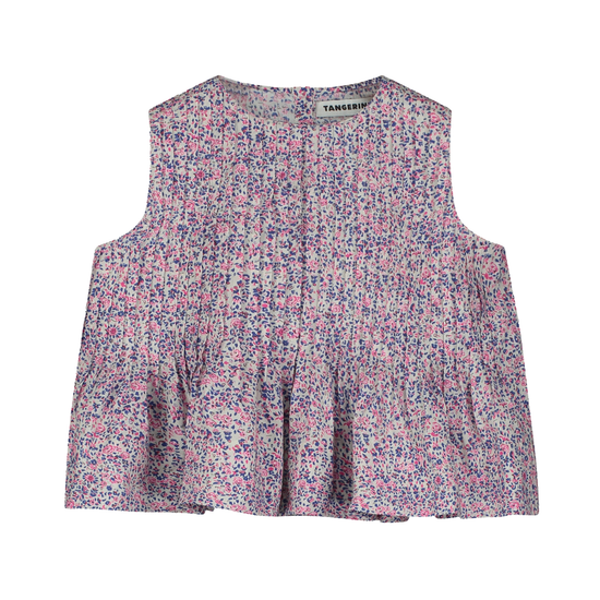 Pleated blouse made from cotton voile styled with this season Tangerine flower print, pin-tucked pleats that release into a peplum with a tank cut and back button closure. Lined.