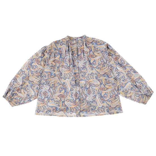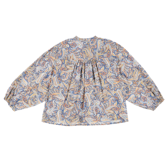 Brusa de popelina amb dibuix pasley, plisada a l'escot i punys. Canesú de les espatlles no plissat, ajust fluix i màniga llarga voluminosa. Escot rodó amb tancament de botó davanter.