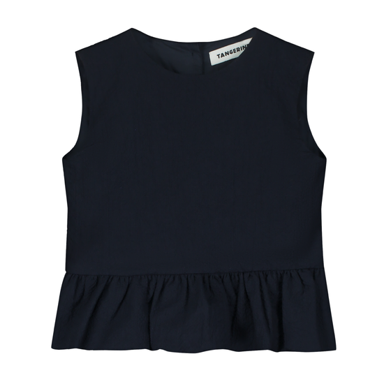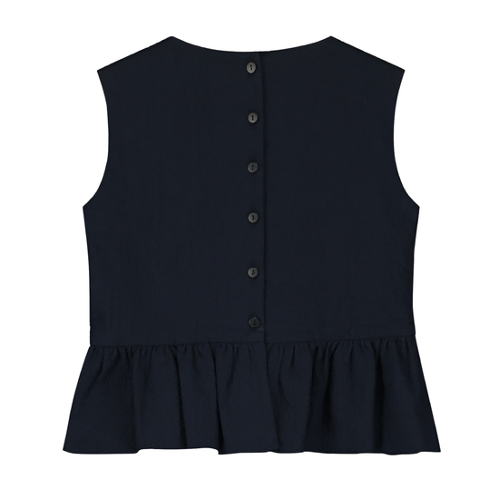 Seersucker peplum blouse made from cotton styled with back button closure. Lined.
