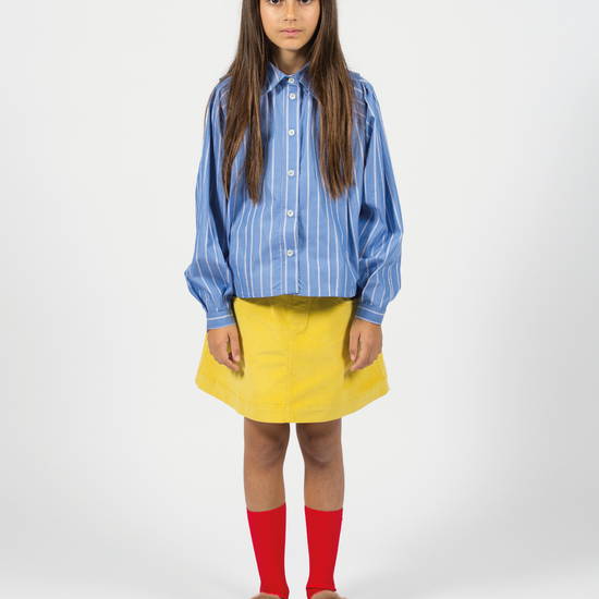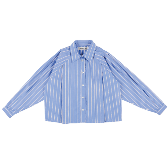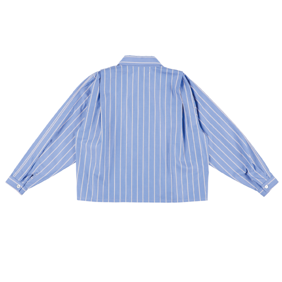 Brusa d'ajust relaxat de popelina de cotó retallada amb mànigues llargues i voluminoses i coll clàssic. Tancament amb botó.