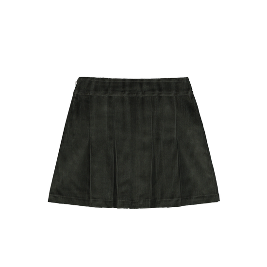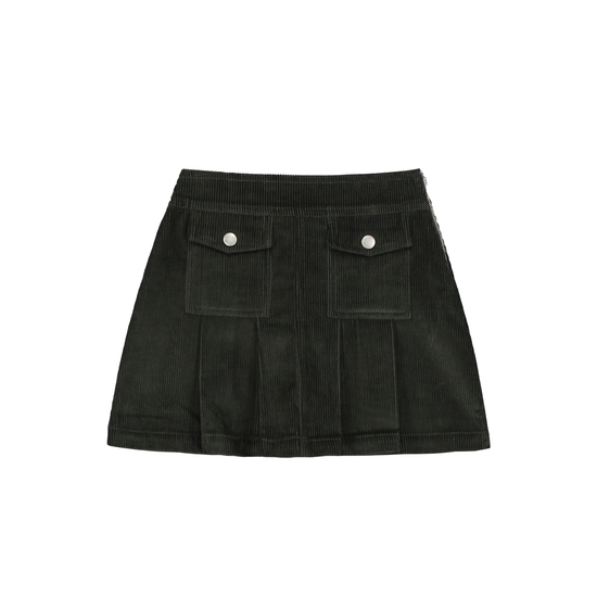 Minifalda plisada de pana. Pliegues clásicos con dos bolsillos de solapa y broches a presión. Cierre con cremallera oculta.