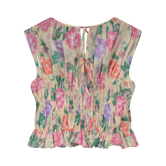 Blouse made from flower motif voile cotton styled with smocked detailing across the body, round neckline and peplum with flared hemline. Back closure with ties.