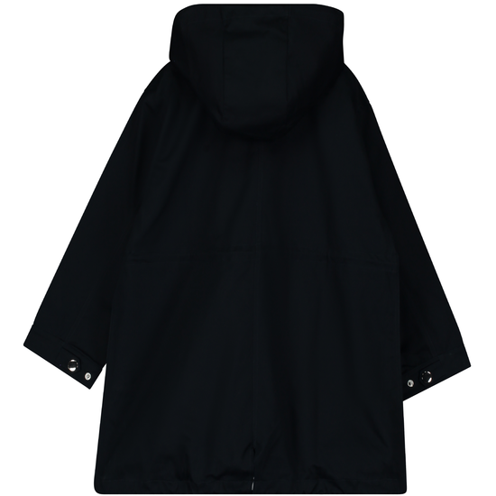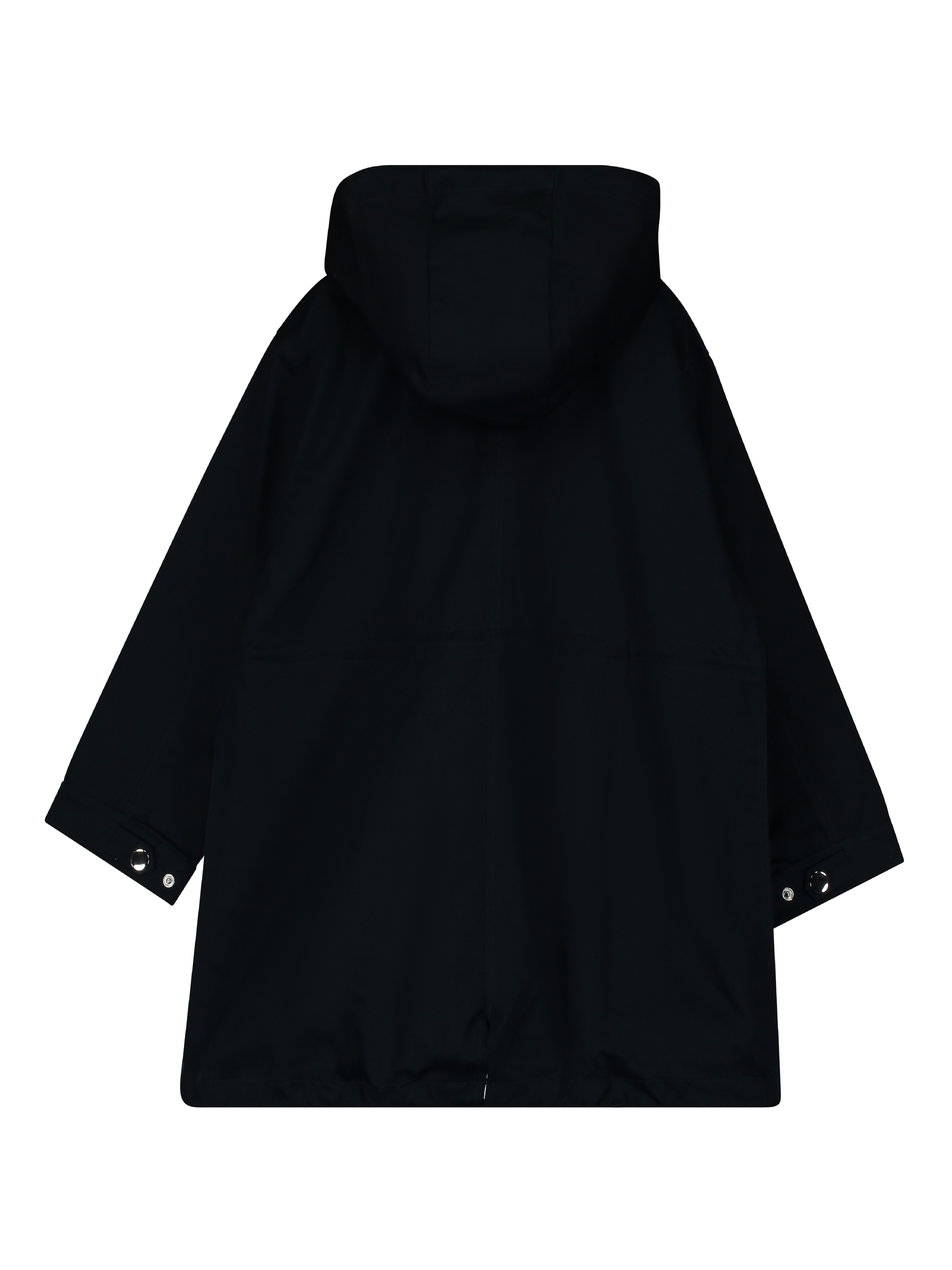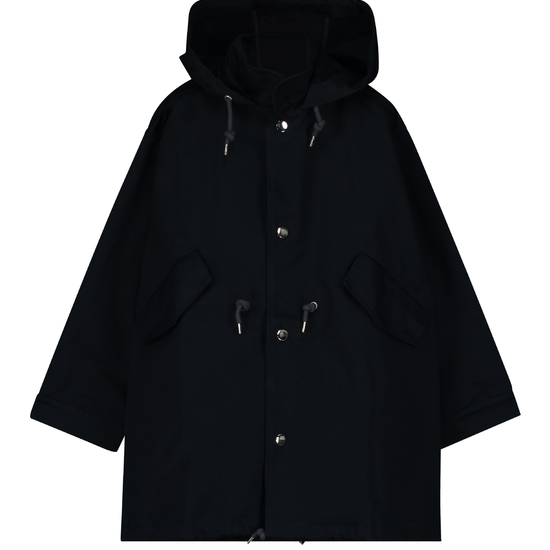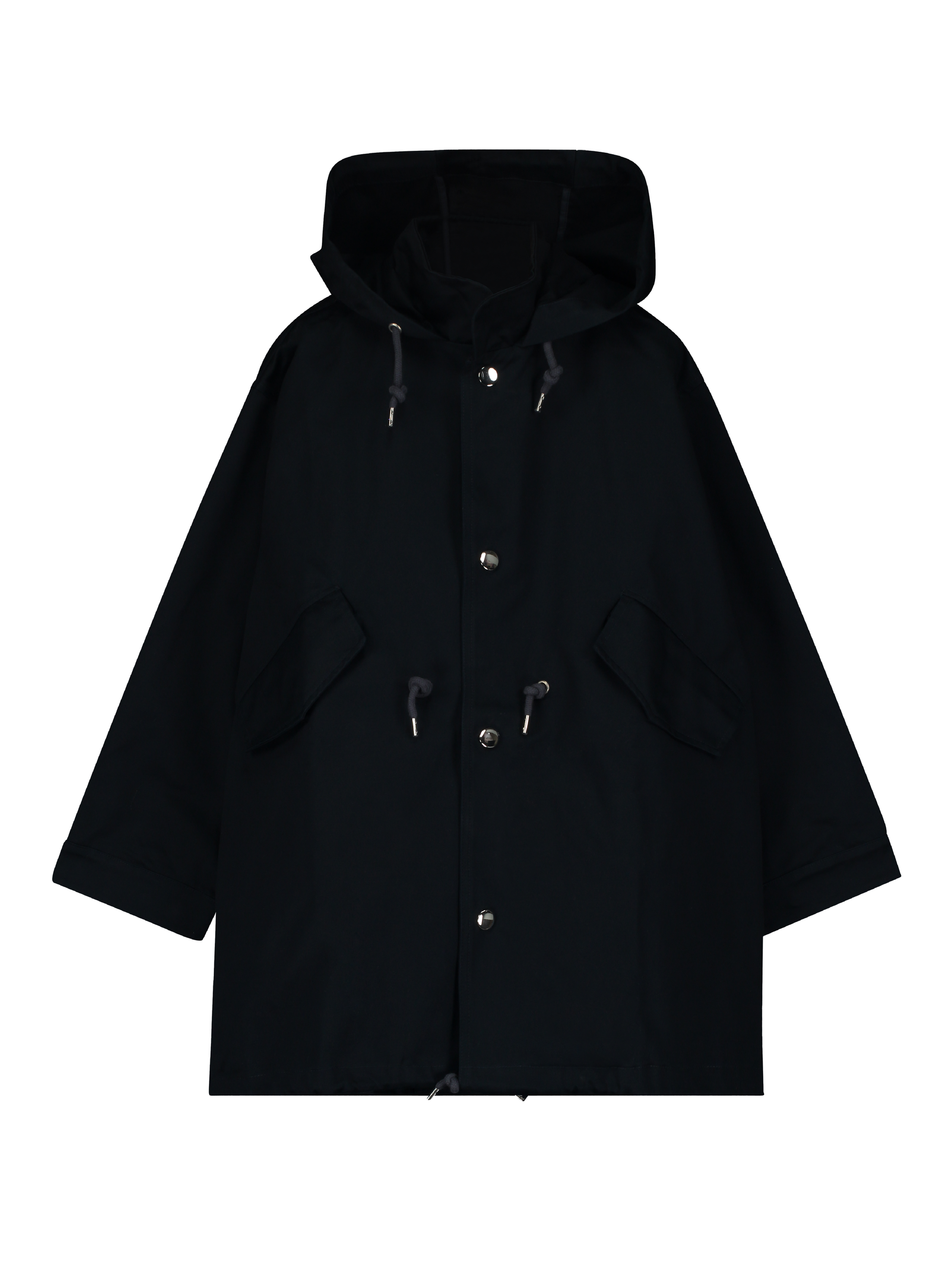 Mid-cut parka made from cotton blend. Cocoon silhouette with stand collar, rear gathering and drawstring hem. Finished with a concealed zip closure and welt pockets.