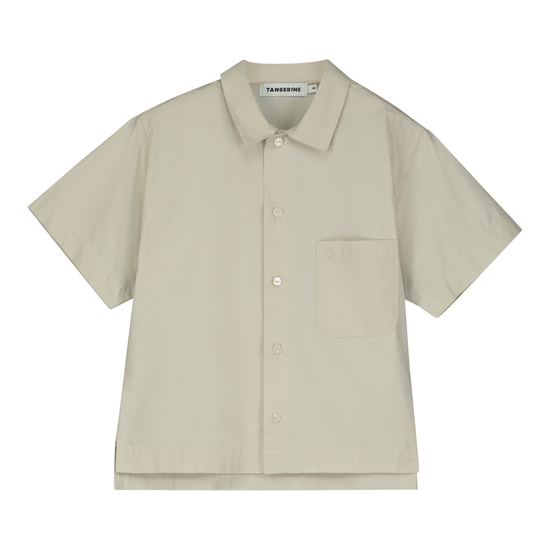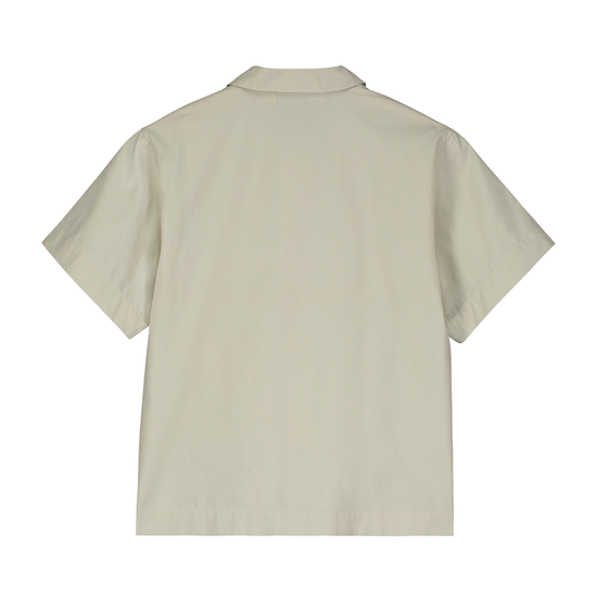 Short sleeved shirt made from poplin cotton styled with boxy fit, button closure and polo hem. Garment dyed.