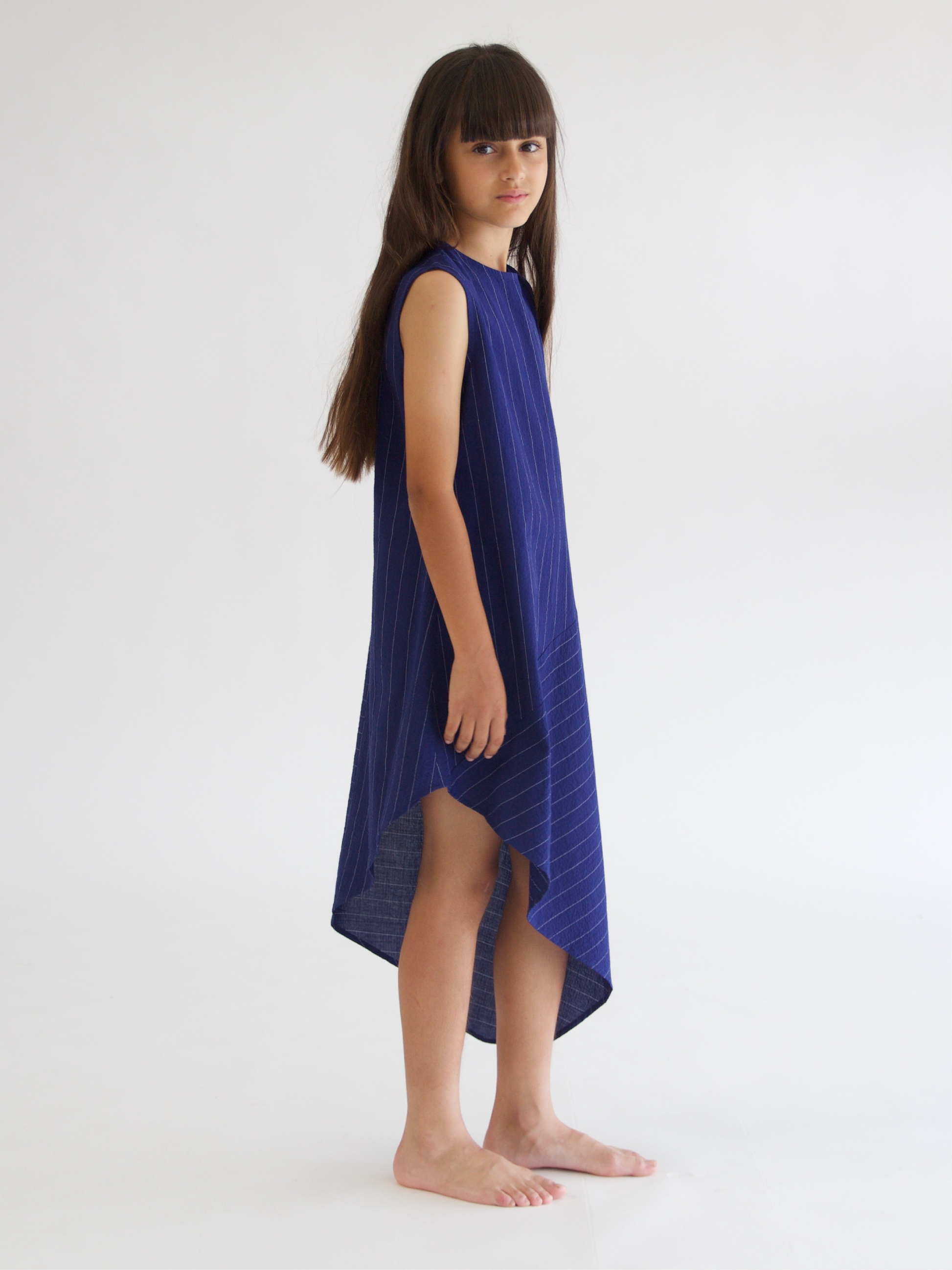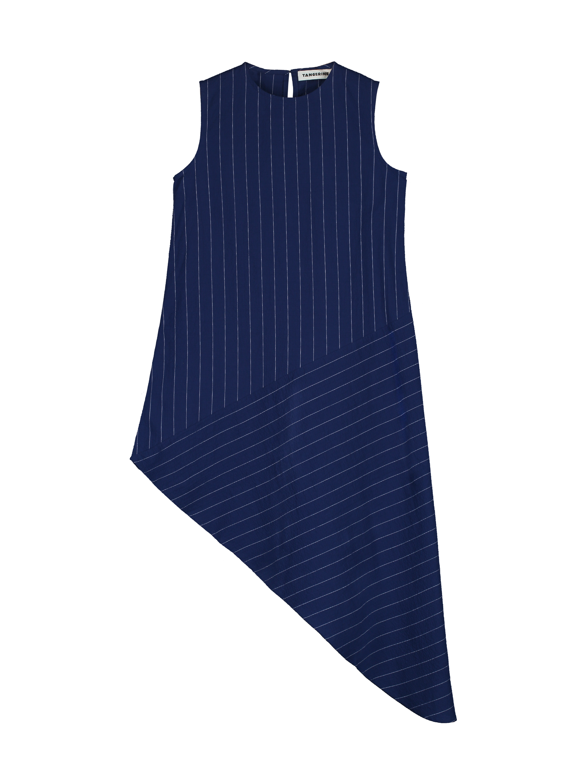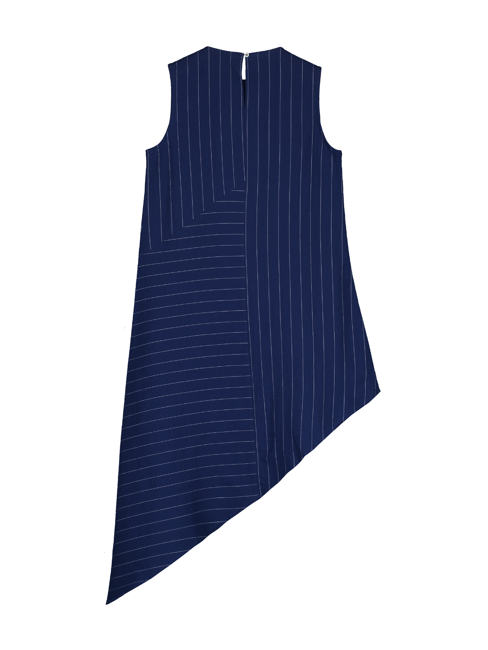 Asymmetrical dress made from seersucker styled with a asymmetrical cut with directional stripes, round neckline with a back single button closure.