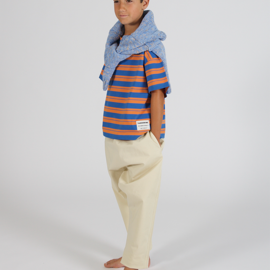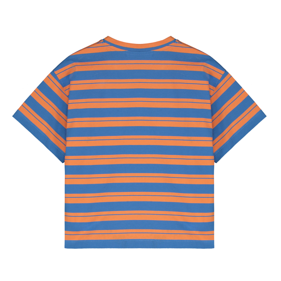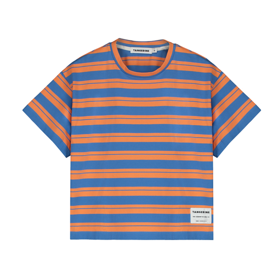 Short sleeved striped t-shirt made from cotton jersey. Relaxed fit with dropped shoulder. Tangerine label stitched on the front. Crew neck.