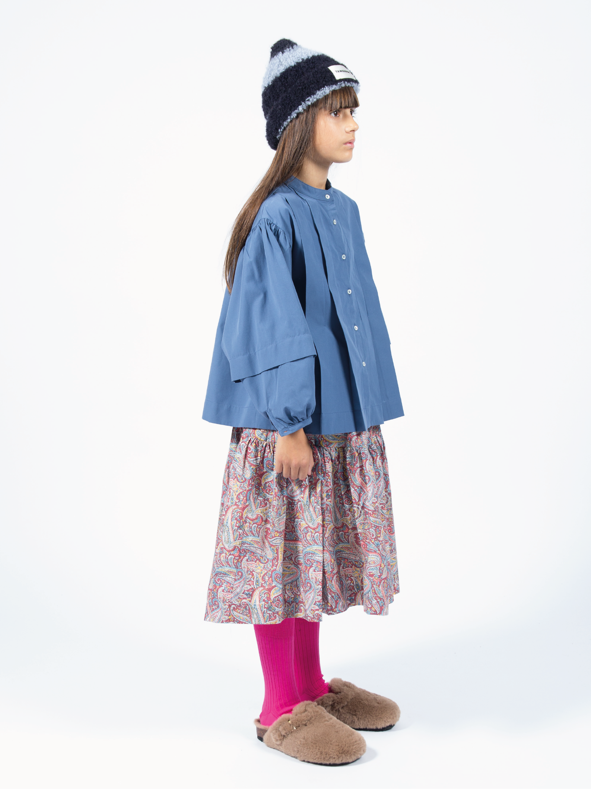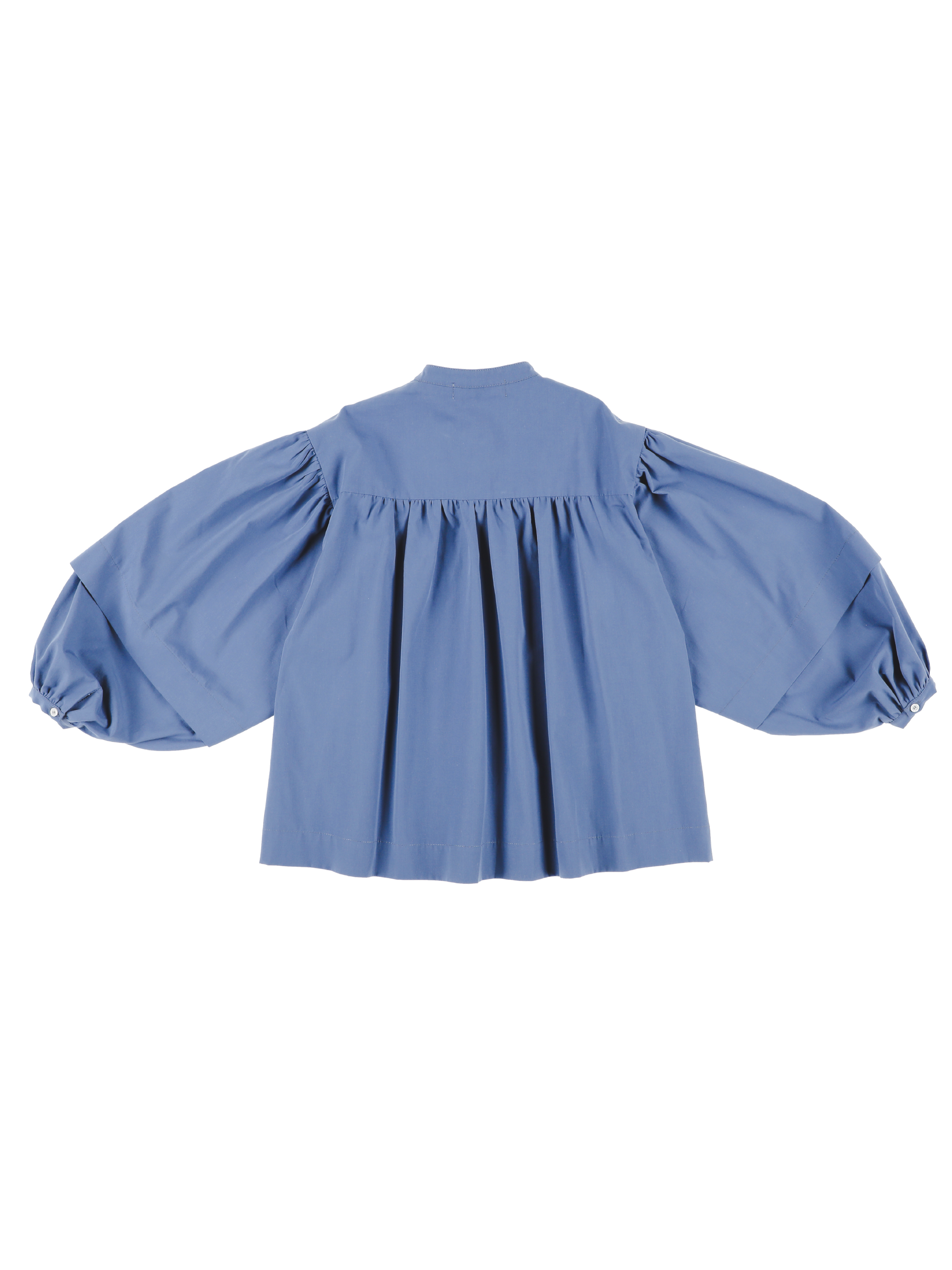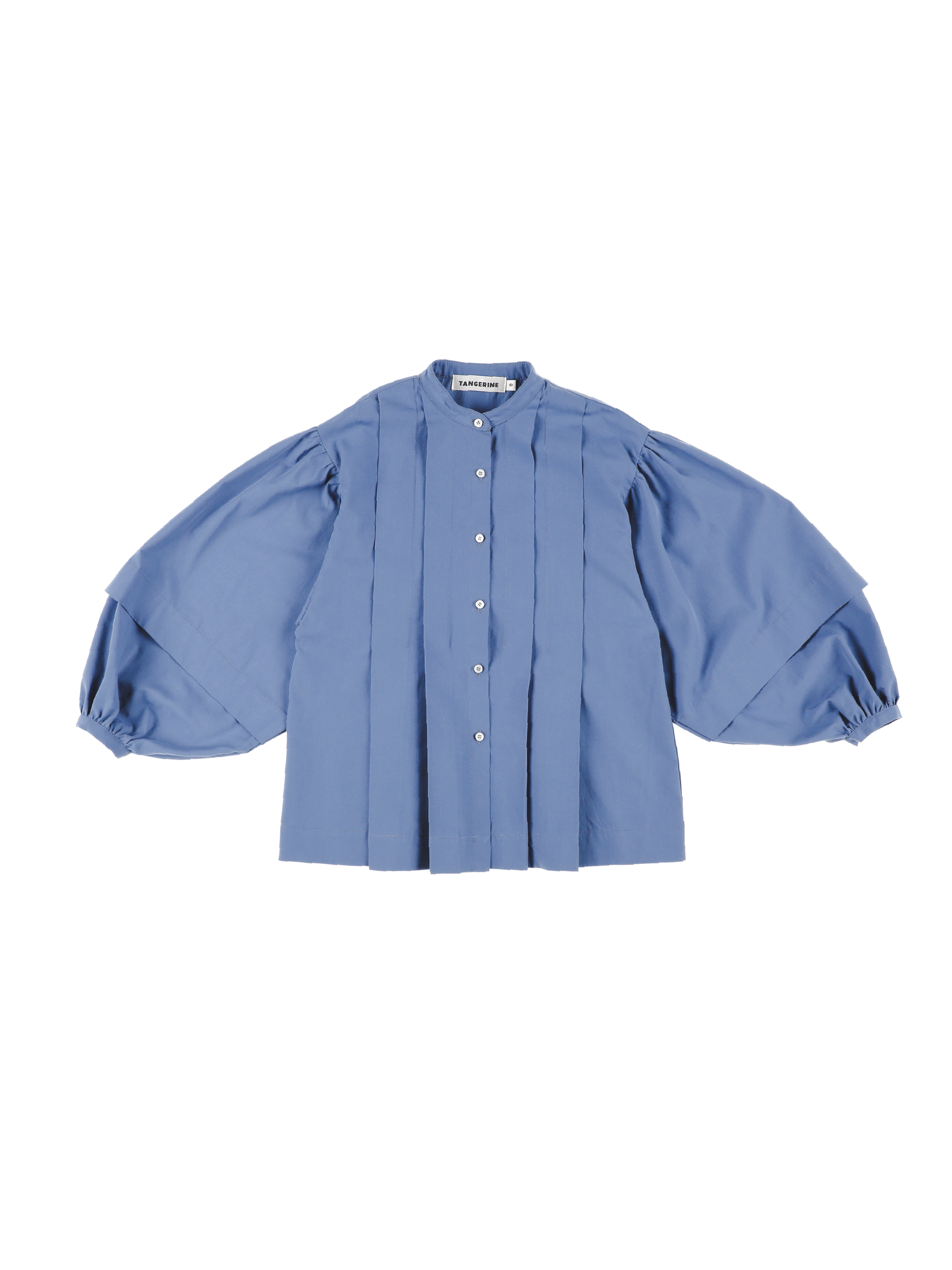 Poplin evasé pleated blouse, round neckline with collar stand, long voluminous sleeves pleated with cuffs.