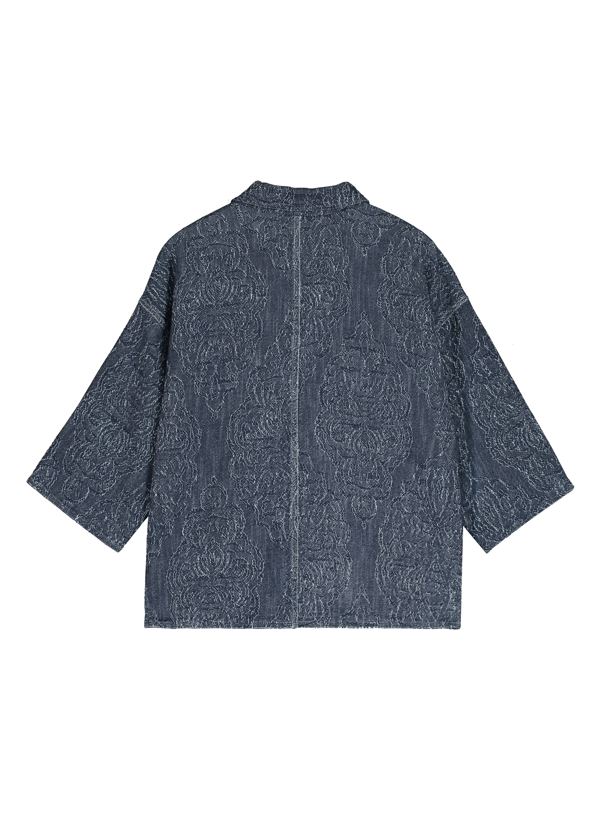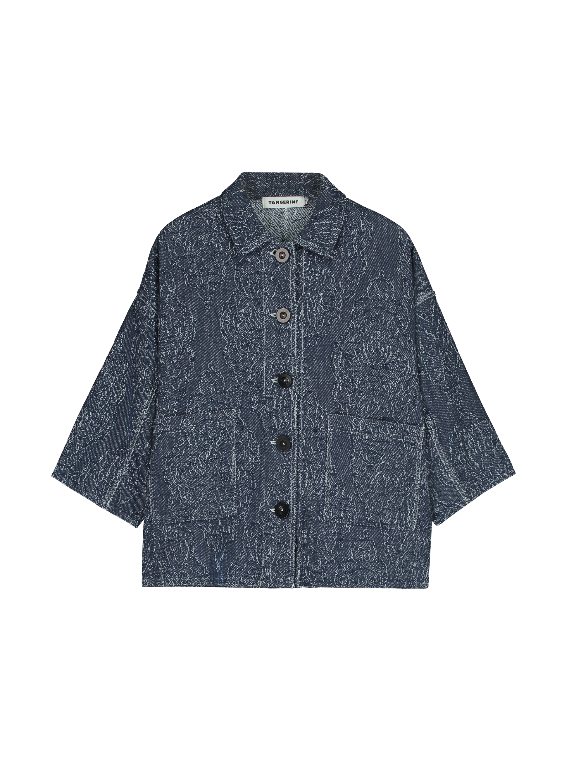 Boxy fit light blue wash jacquard jacket, styled with dropped shoulders and two side pockets, frontal buttoned closure and contrast yoke.