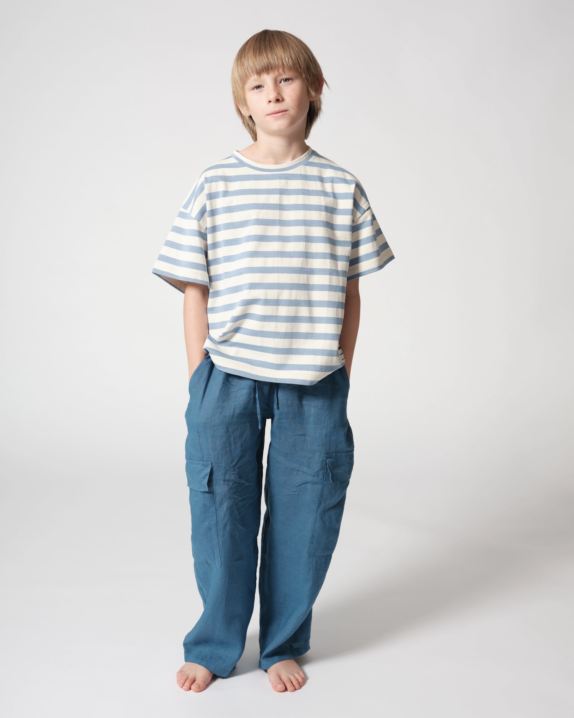 Relaxed fit trousers with elastic waist-band and patch pockets. Garment dye.