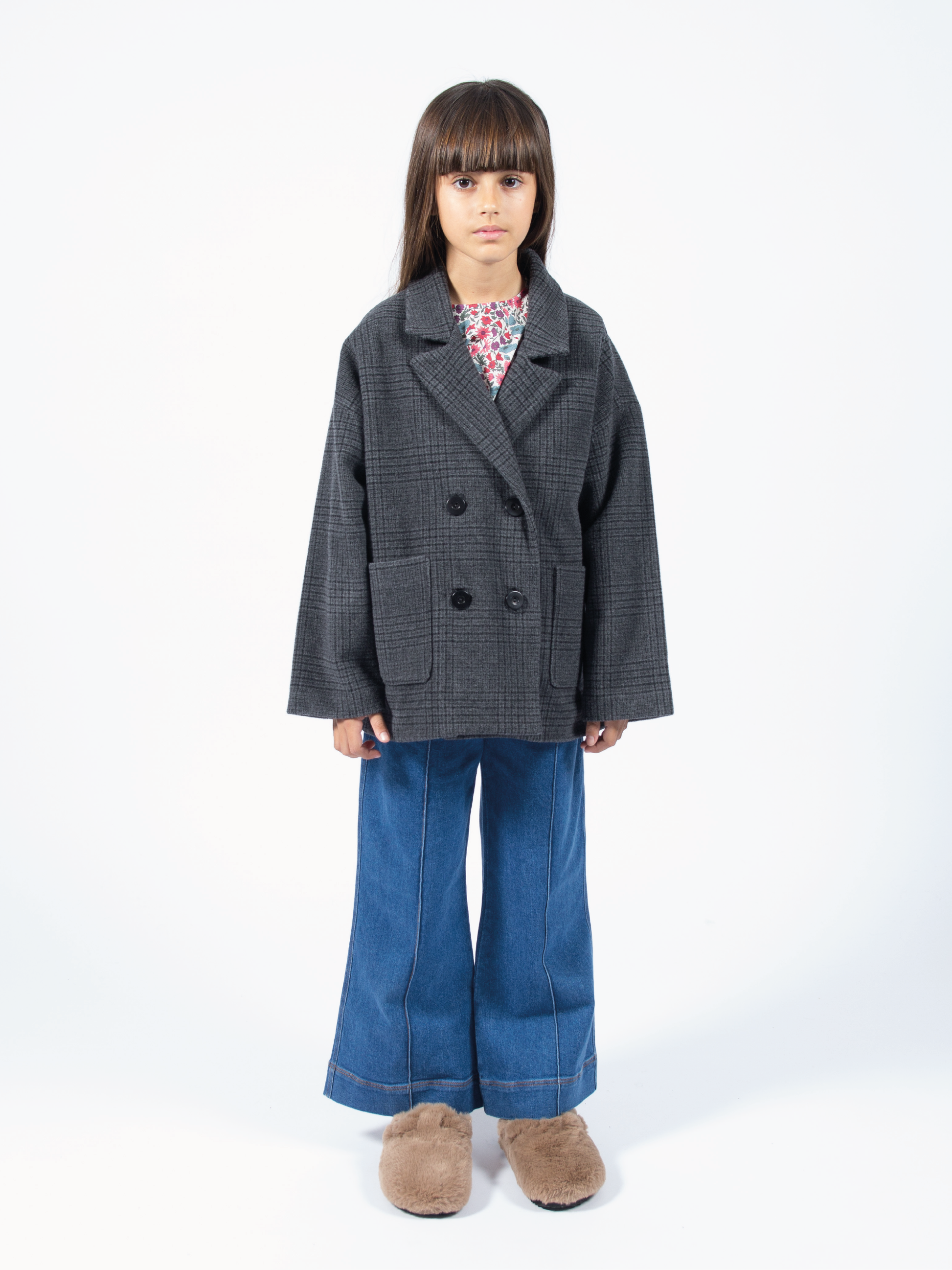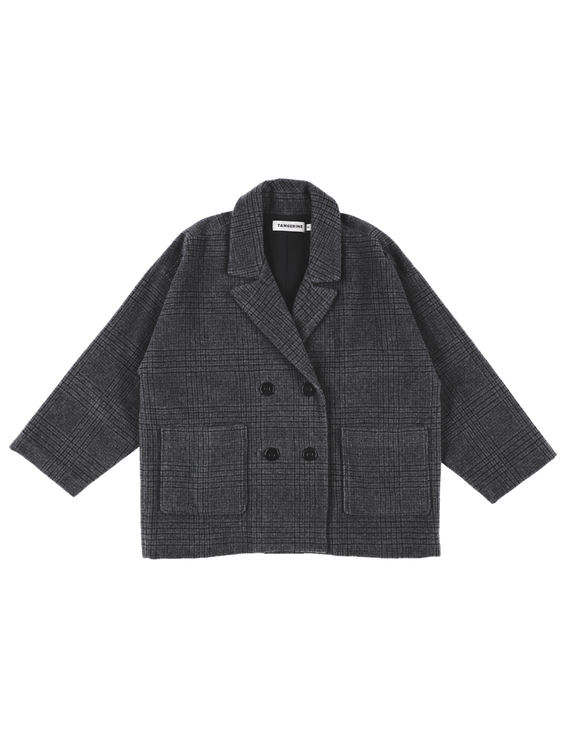 Loose-fit jacket. Cocoon silhouette, styled with wide lapels, side patch pockets and double breasted 4 button closure. Lined.