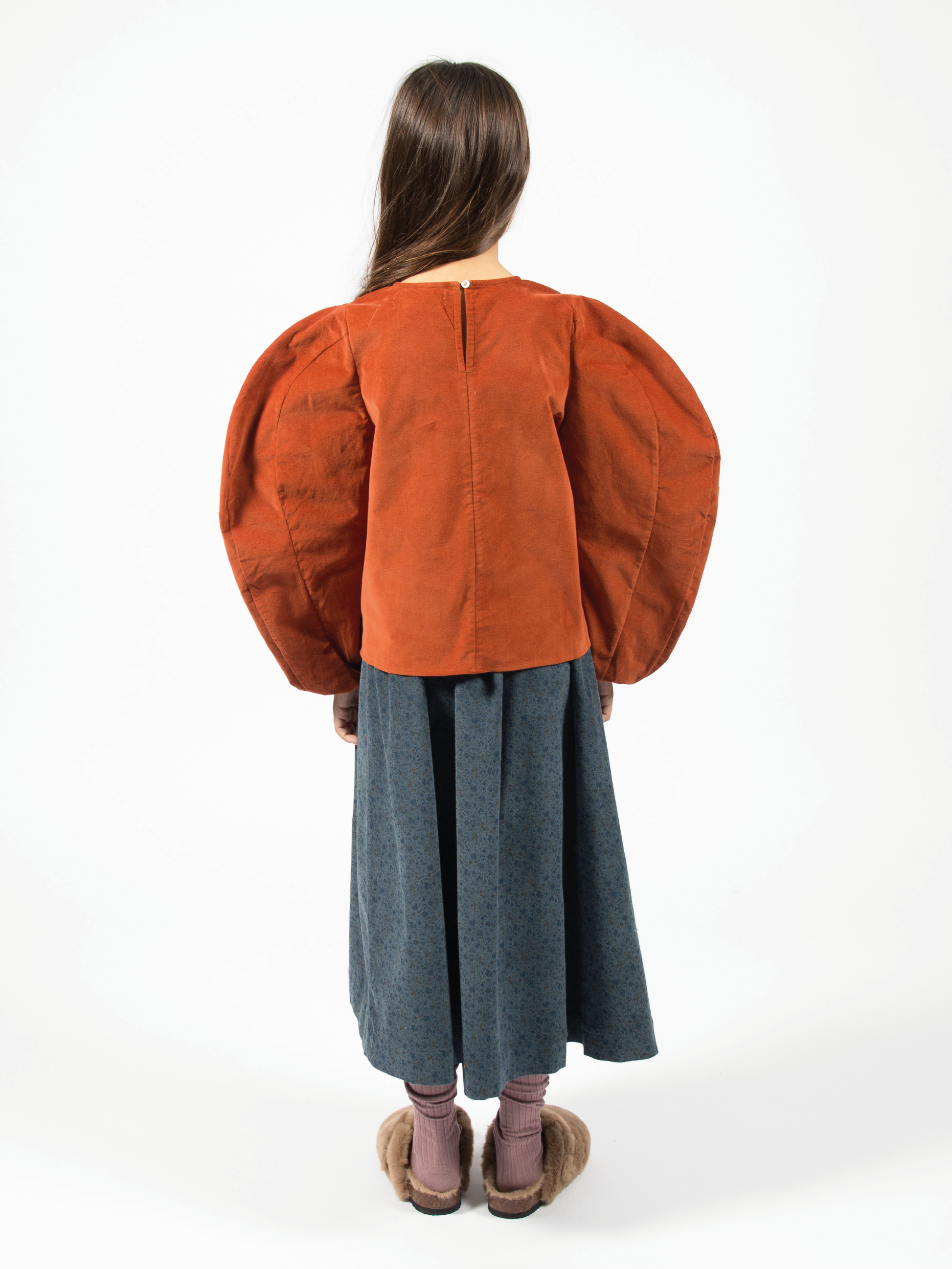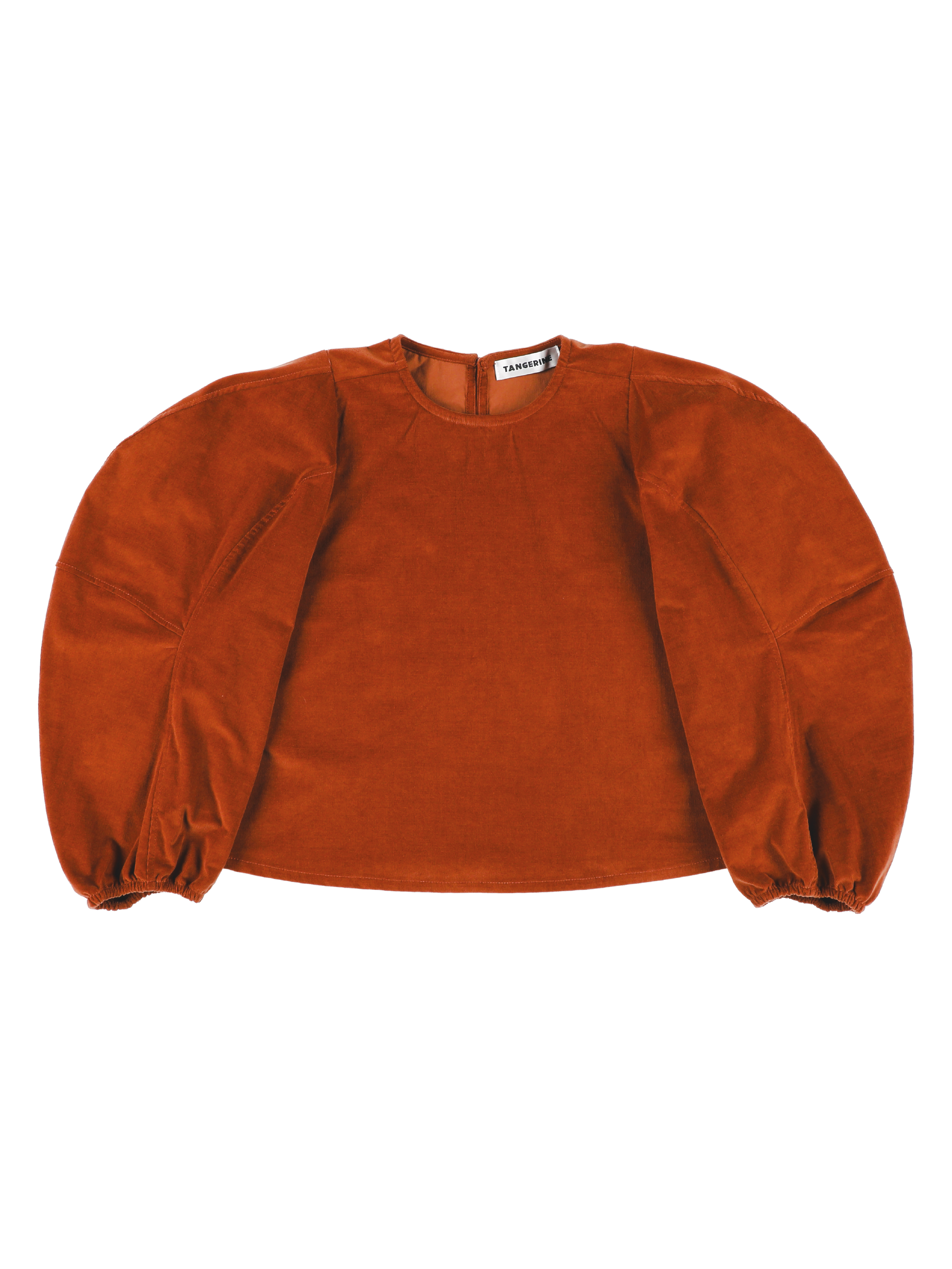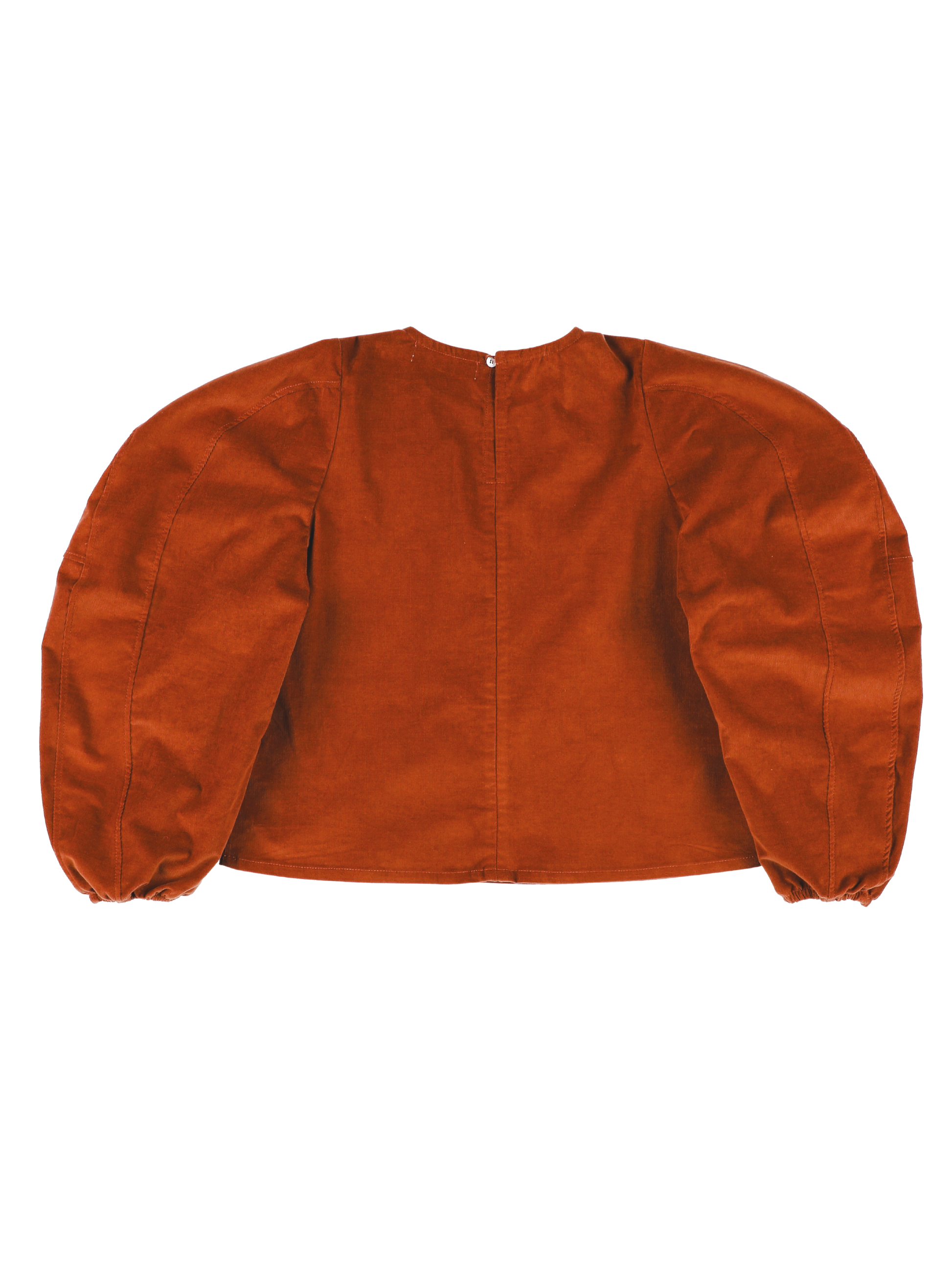 Relaxed fit blouse featuring puff sleeves with cuts and elastic edges, round neckline with back drop fastening with button.