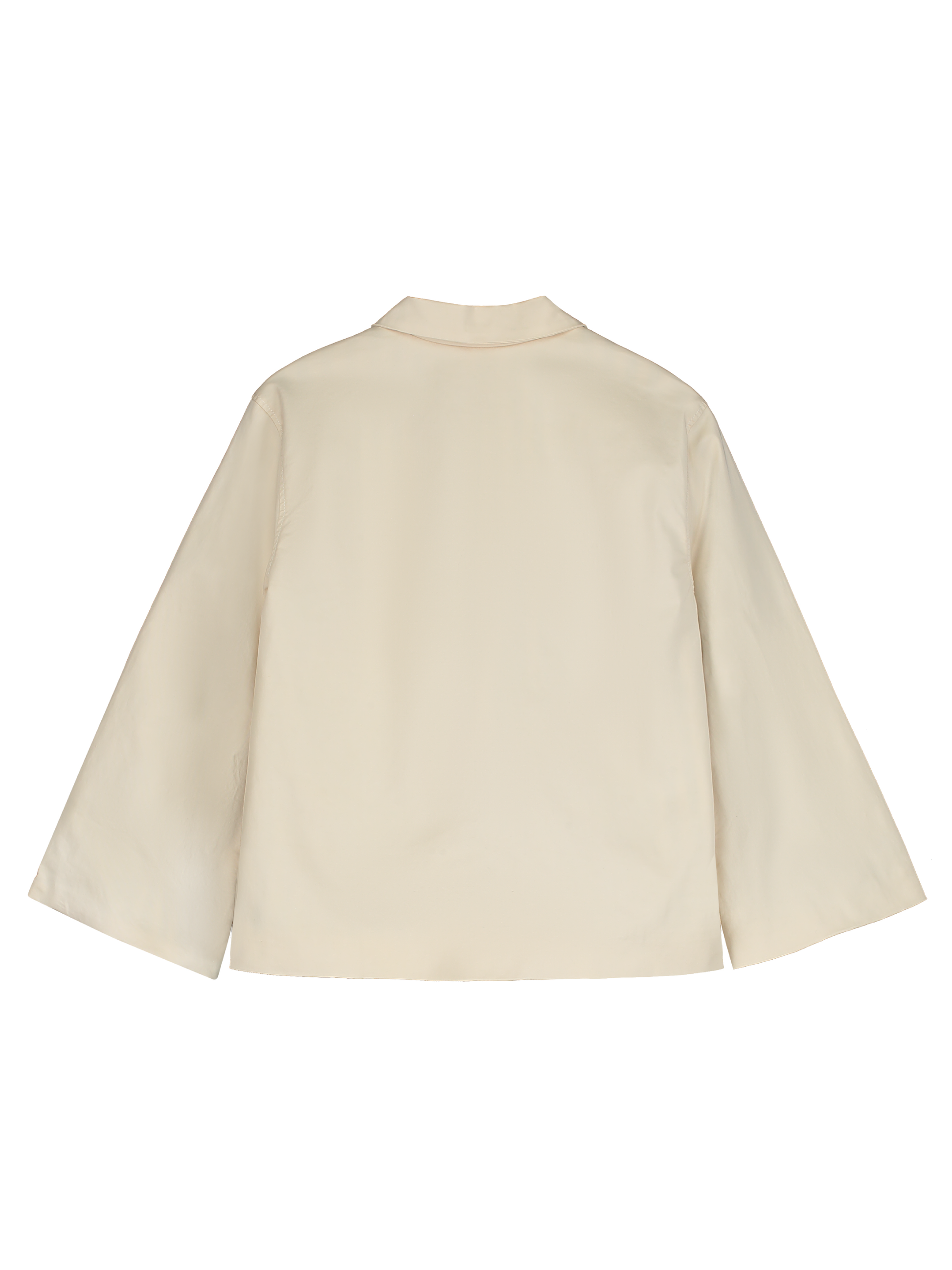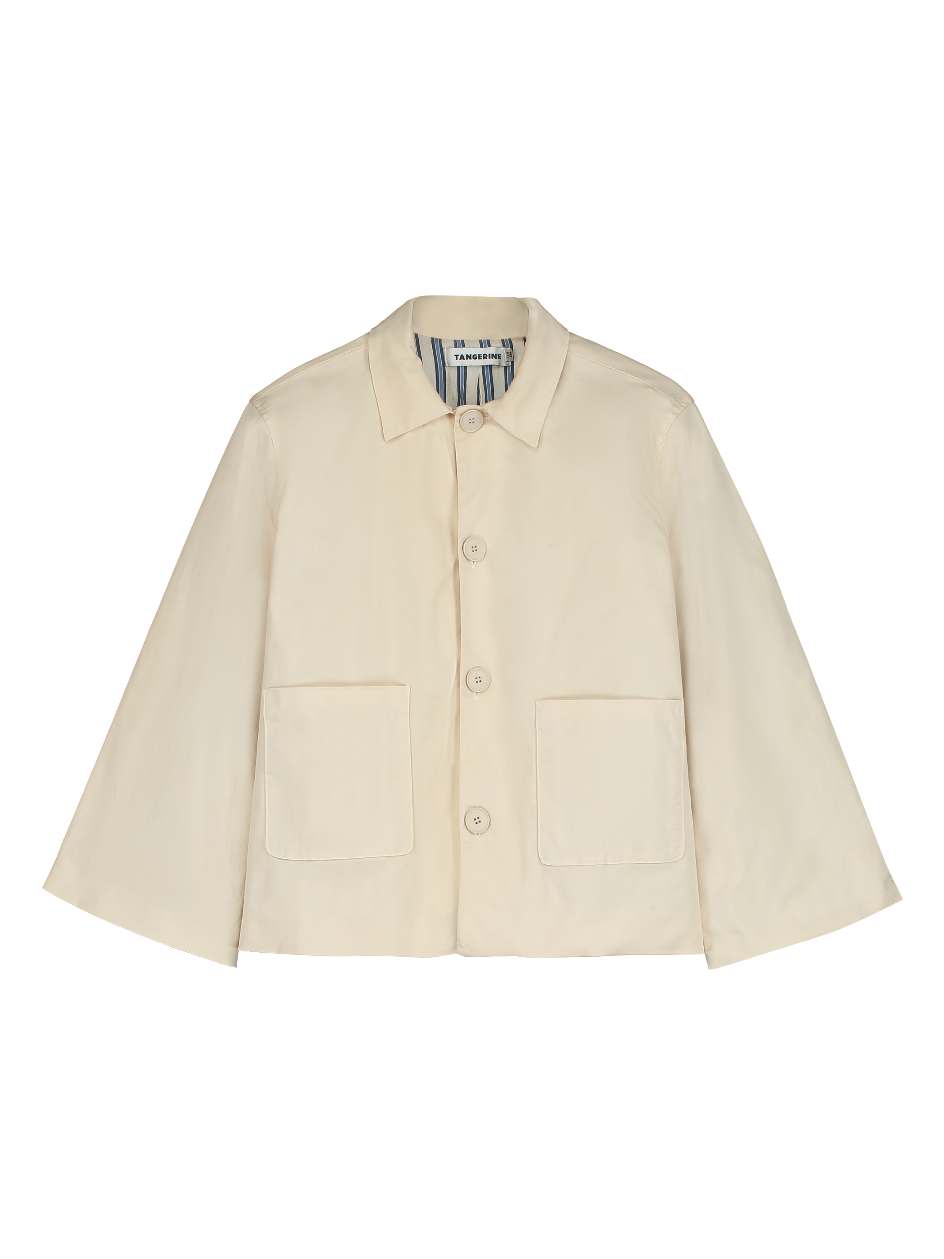 Oversized fit styled with a classic collar and ranglan sleeves, frontal buttoned closure with two side pockets. Lined with contrasting stripes. Garment dyed.