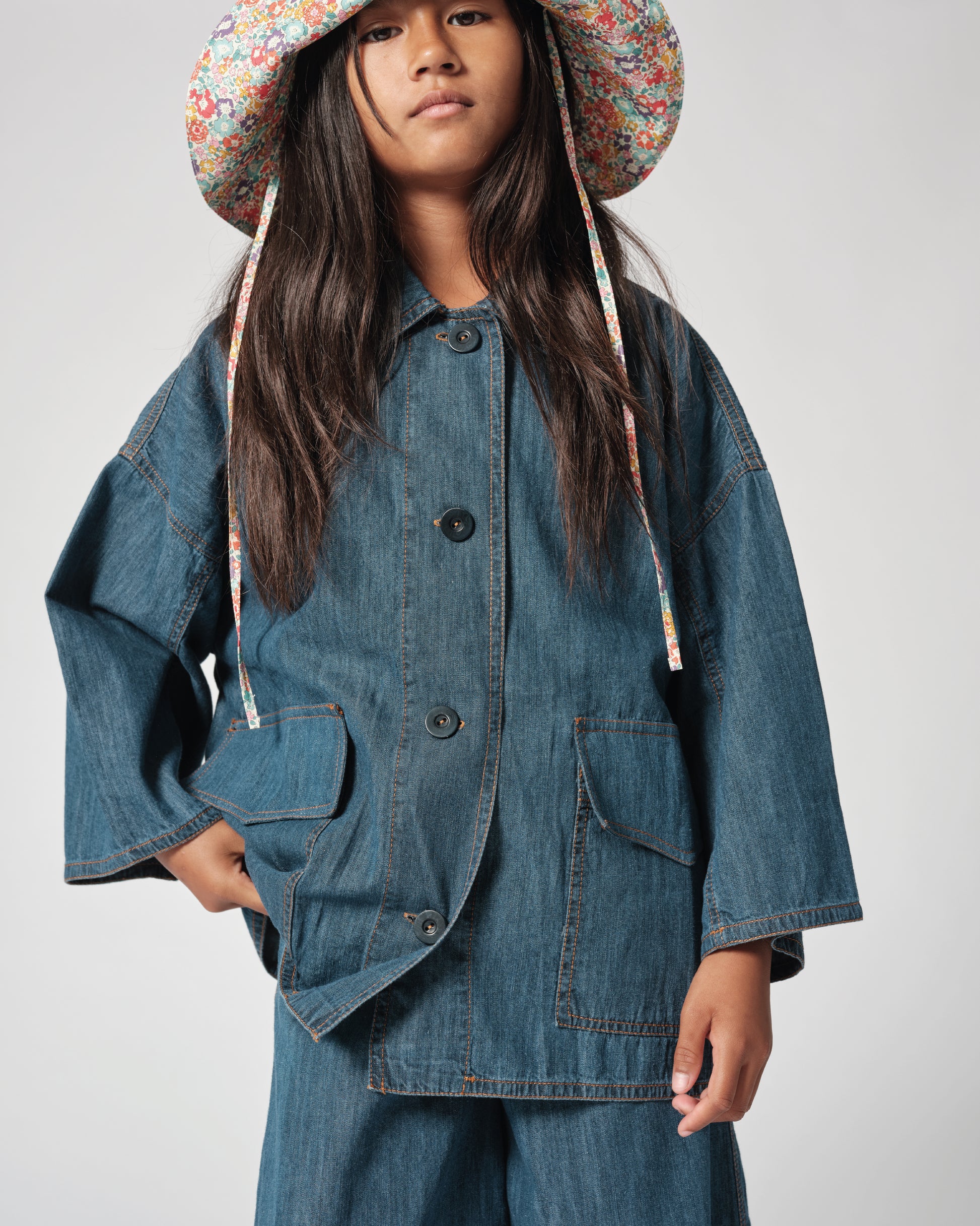 Oversized fit denim overshirt with patch pockets and buttoned on the front.