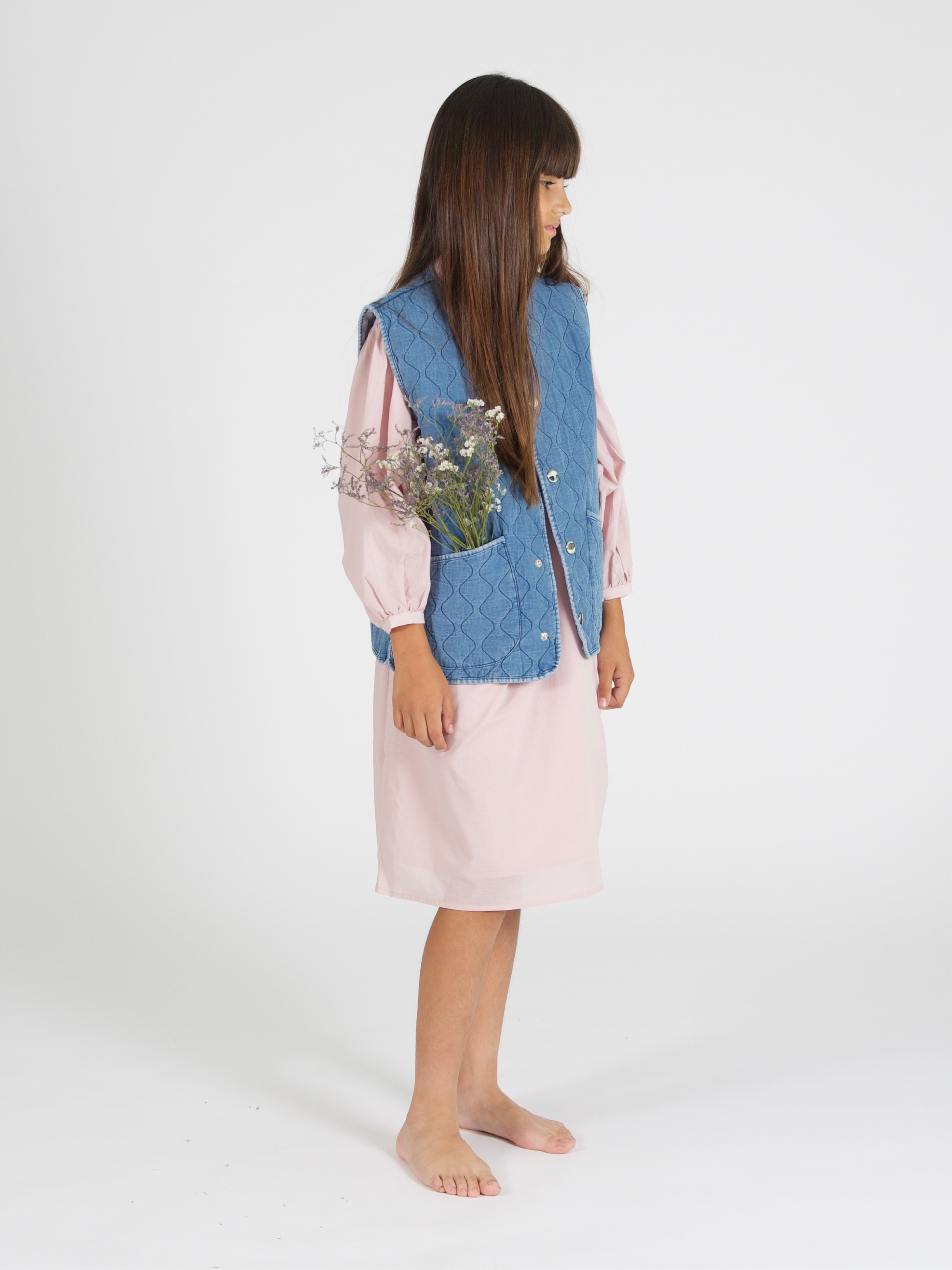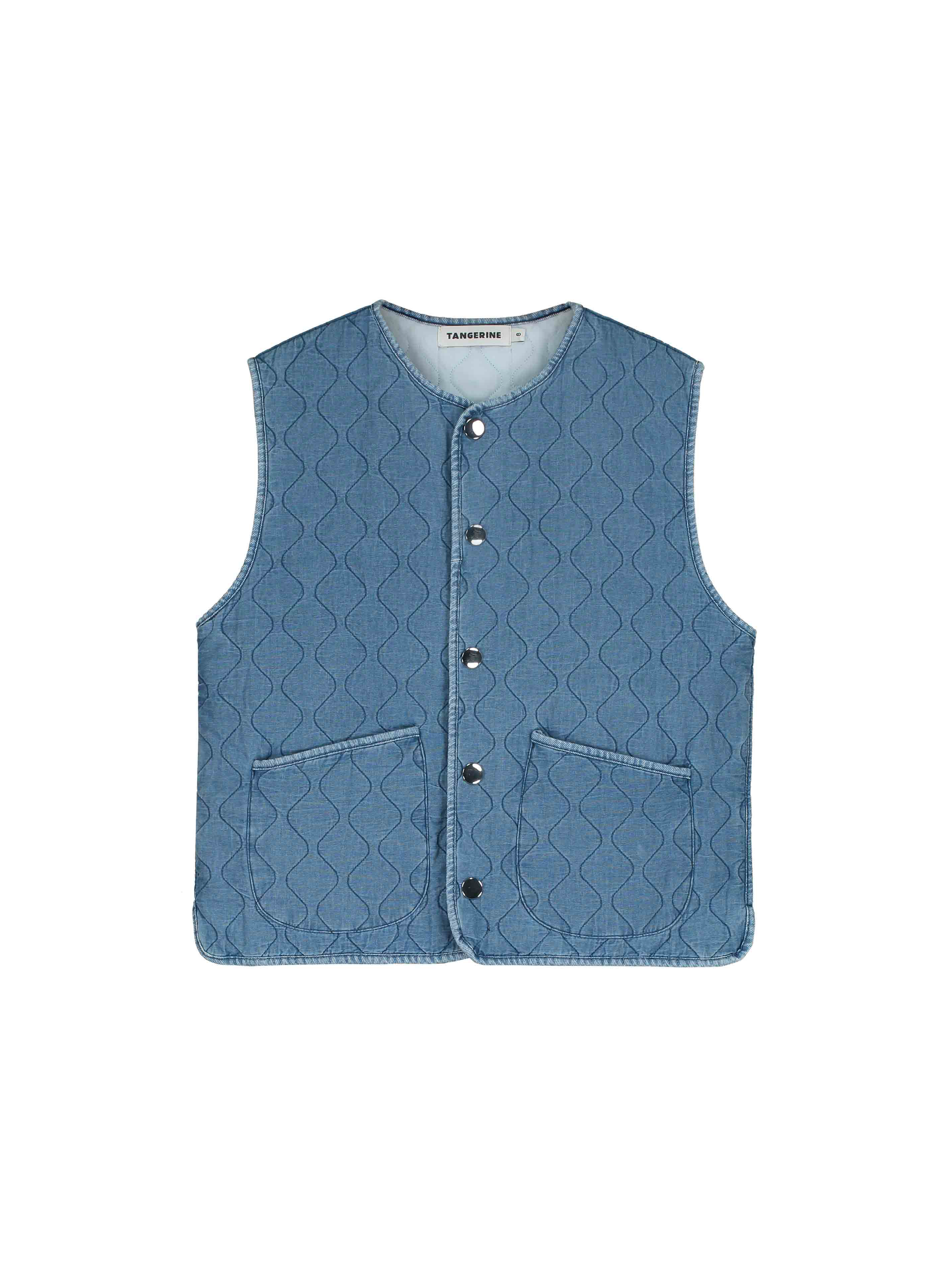 Boxy fit vest made from quilted light blue wash-denim styled with round collar, tonal pipping and two side patch pockets. Fastened with front press stud sand stitched Tangerine label on the back.