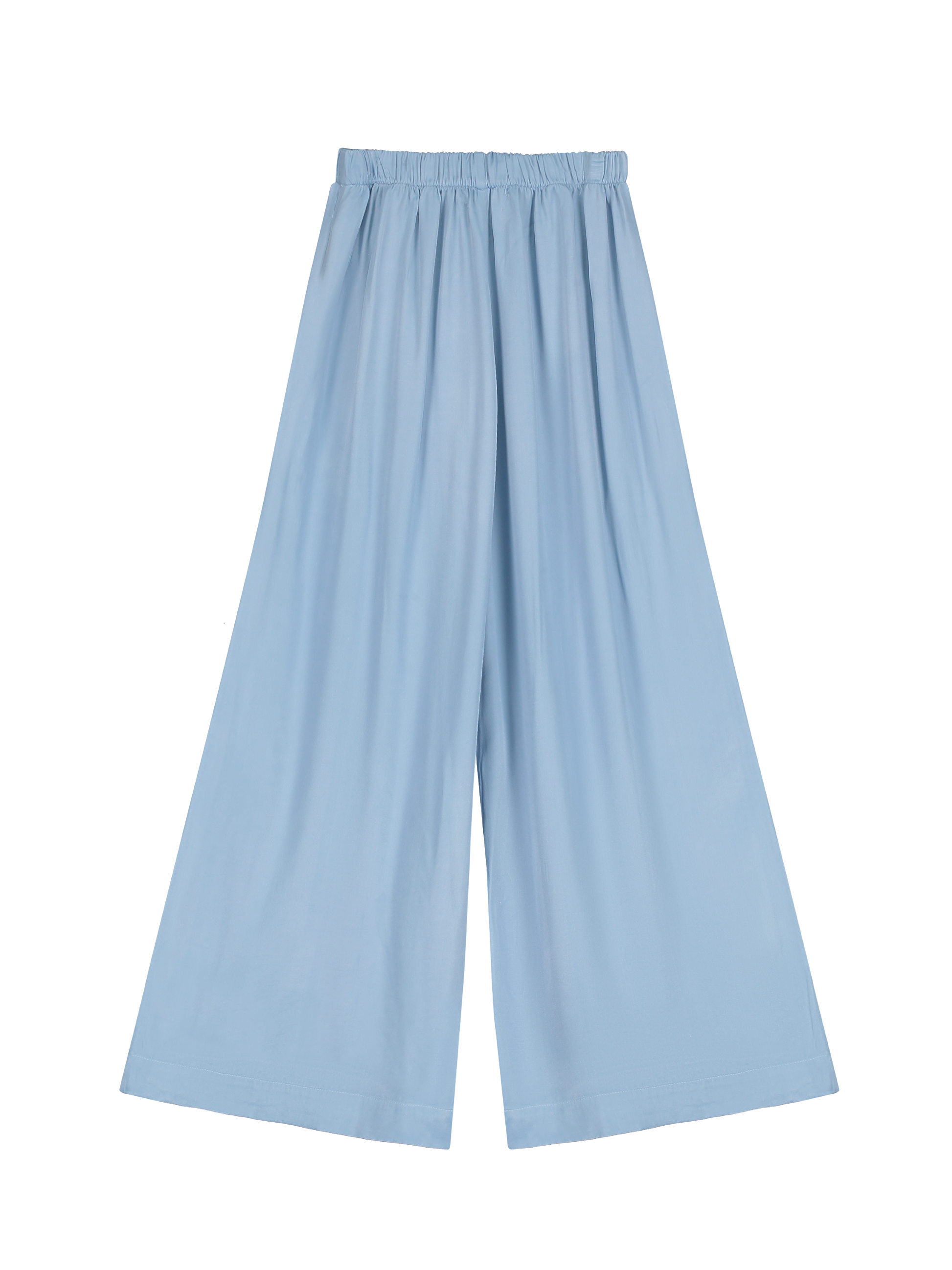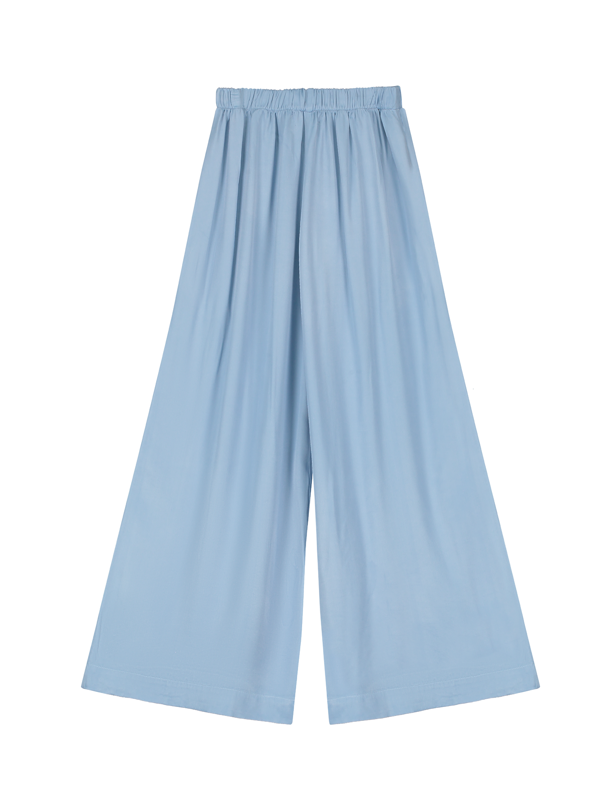 Flared fit trousers made from ecovero satin blend styled with elasticated waistband at back. Garment dyed.