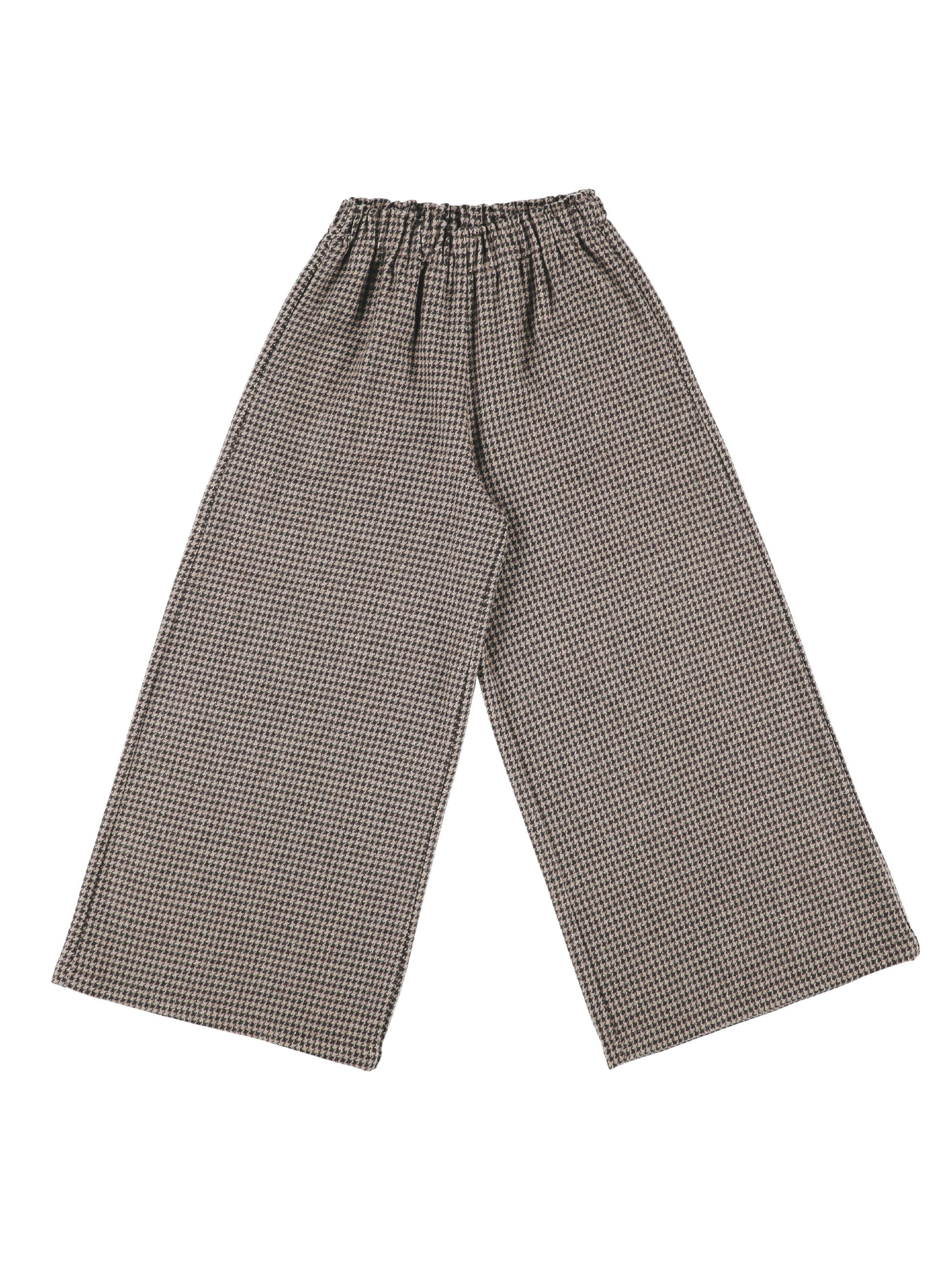 Trousers made from a wool blend with houndstooth check. Ultra-flared silhouette, topped with an elasticated waistband. Side pockets.