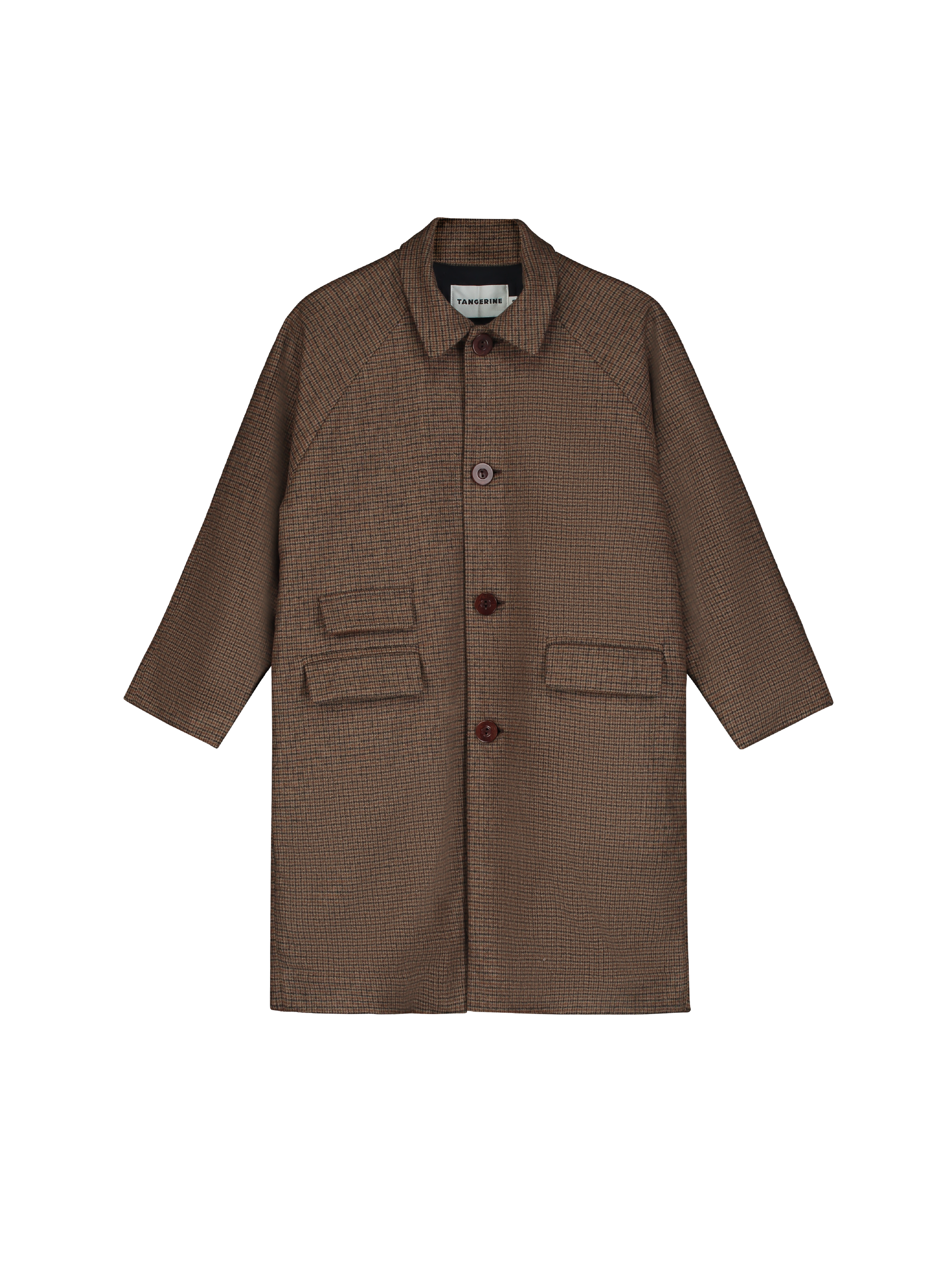 Longline coat made from cream houndstooth check wool blend. Body lined with quilted fabric. Button closure and classic collar. Styled with three flap pockets. Lined.