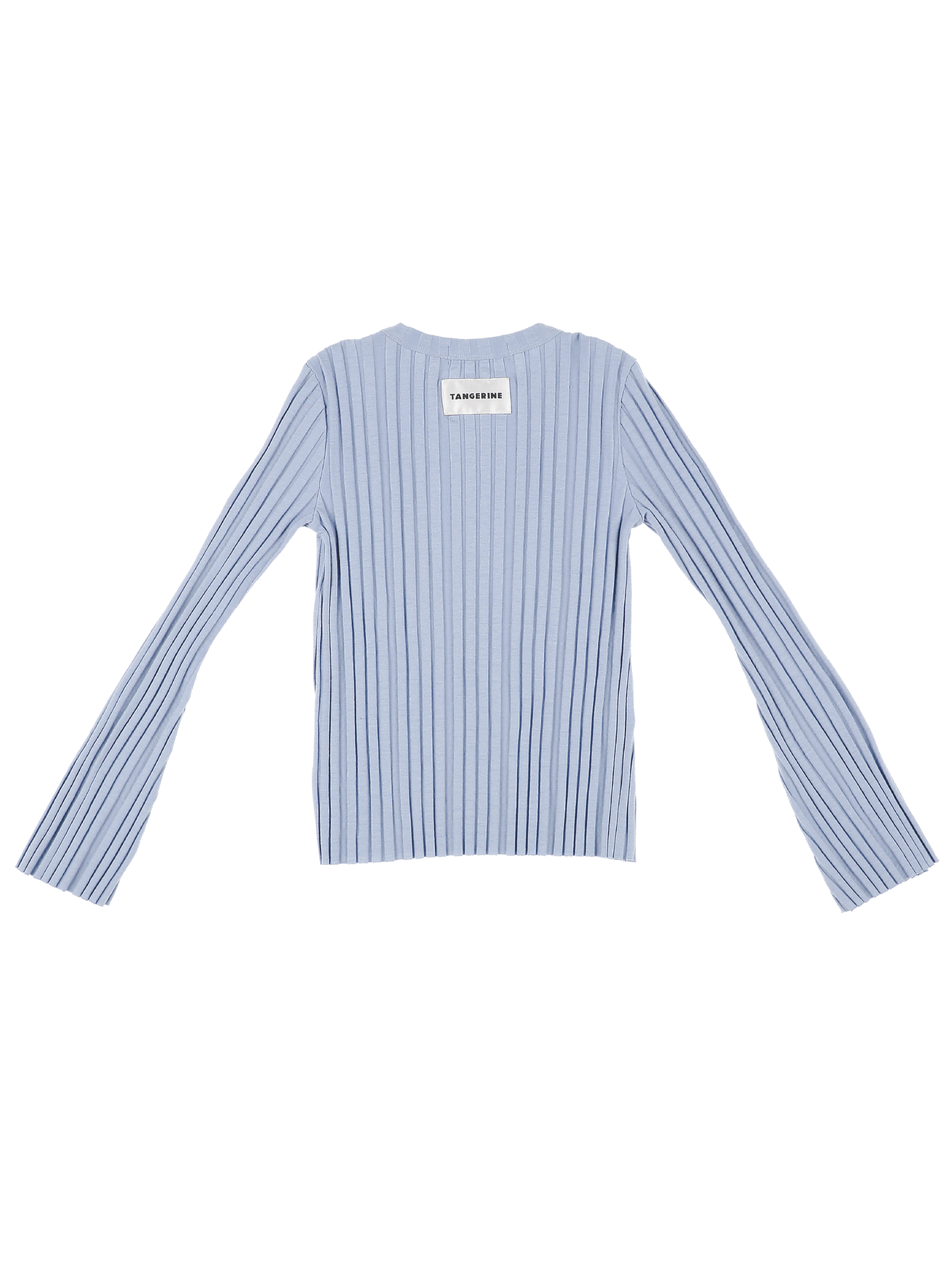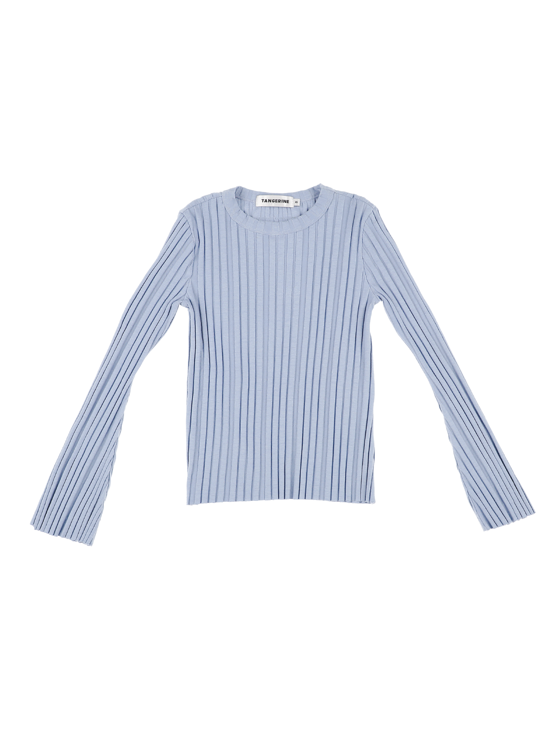 Rib knitted top features a crew neck, slimed fit with long sleeve and wide cuffs. Yarn dyed. Stitched Tangerine label on the back.