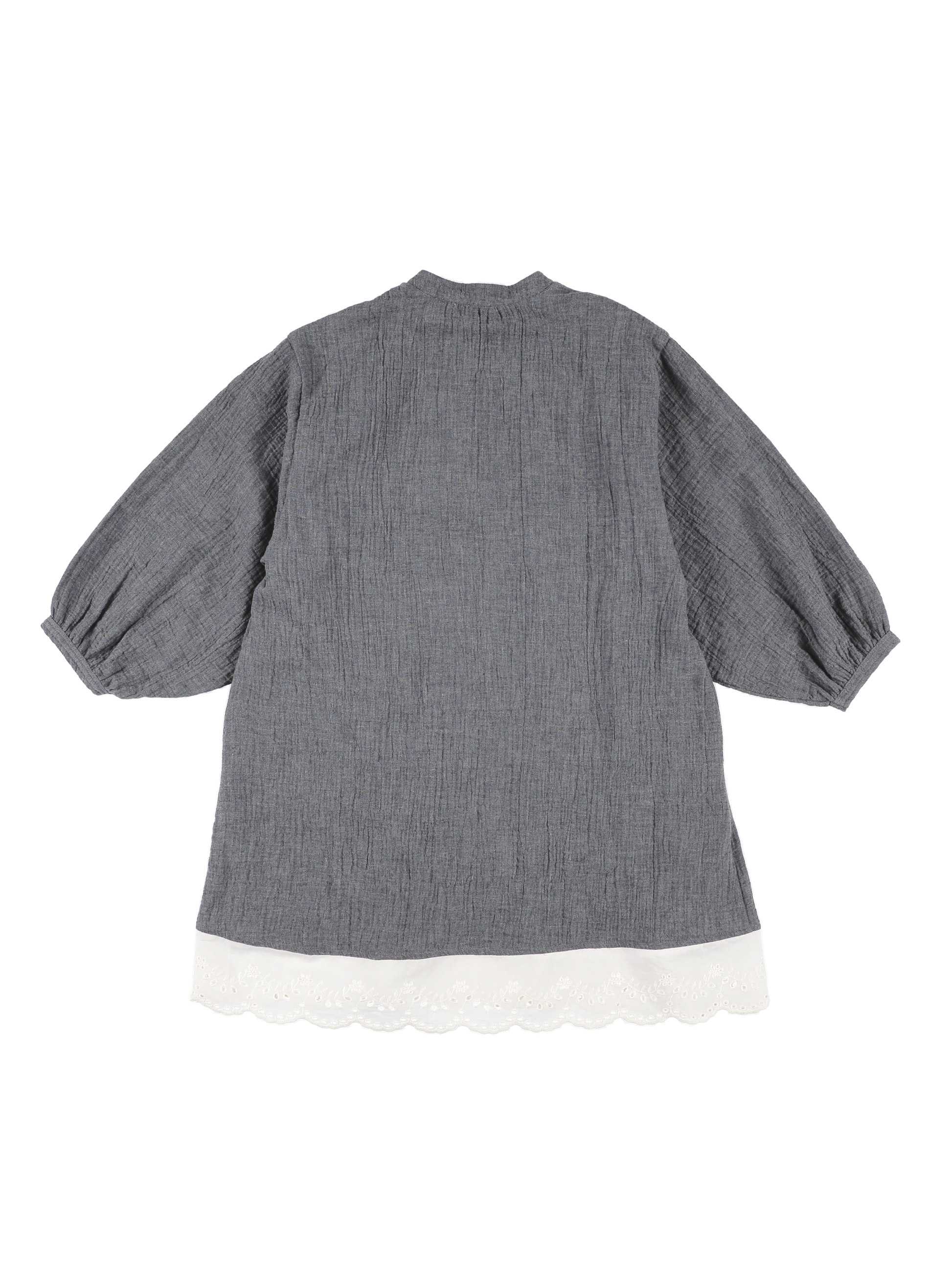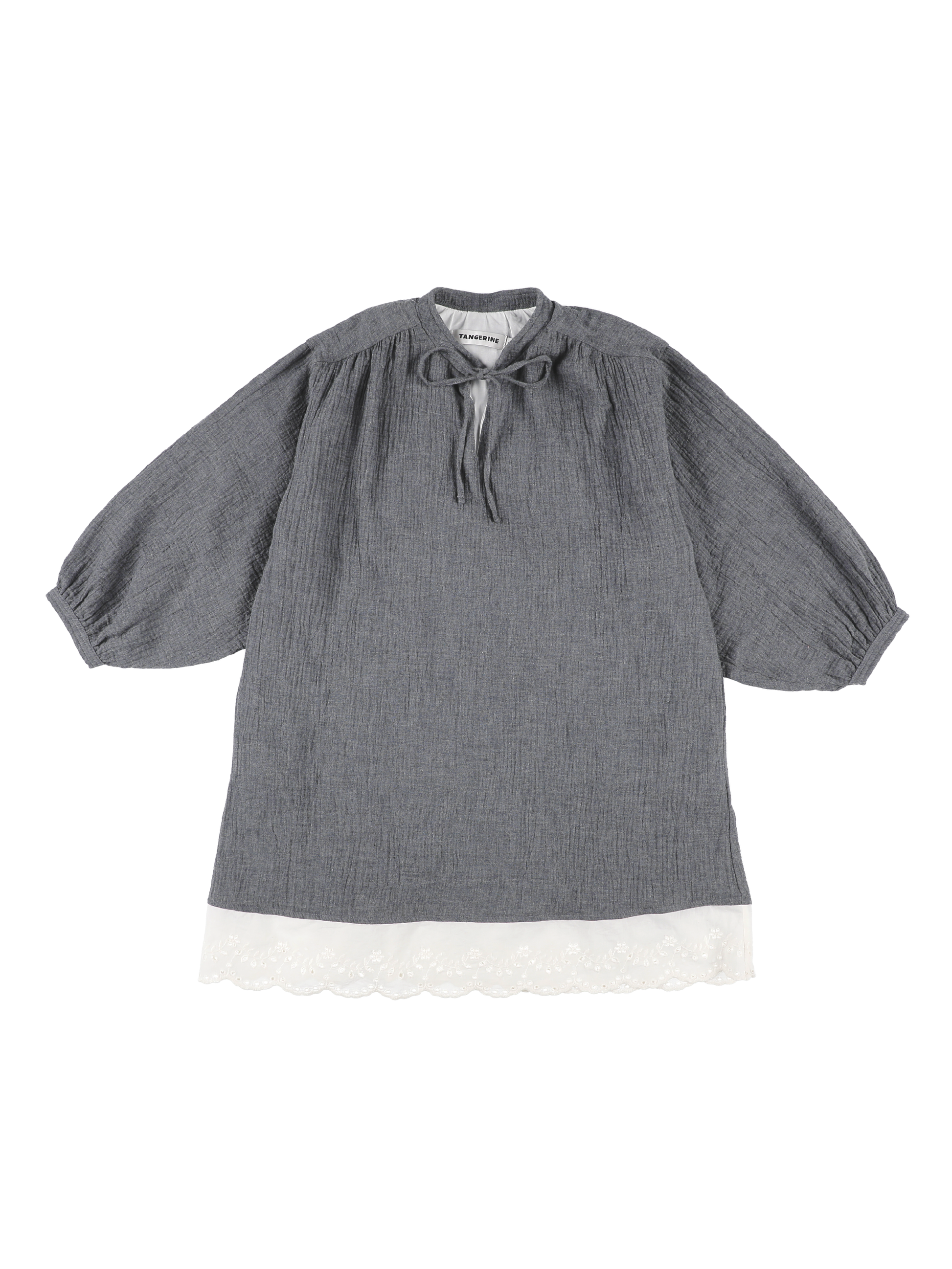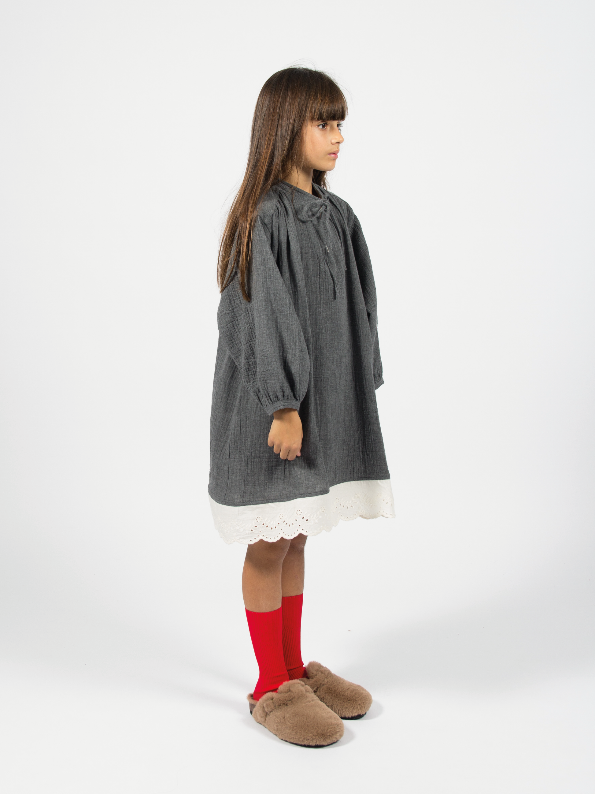 Melagne voluminous long-sleeves dress, tied on the front neckline. Hem with swiss emboidery. Lined.