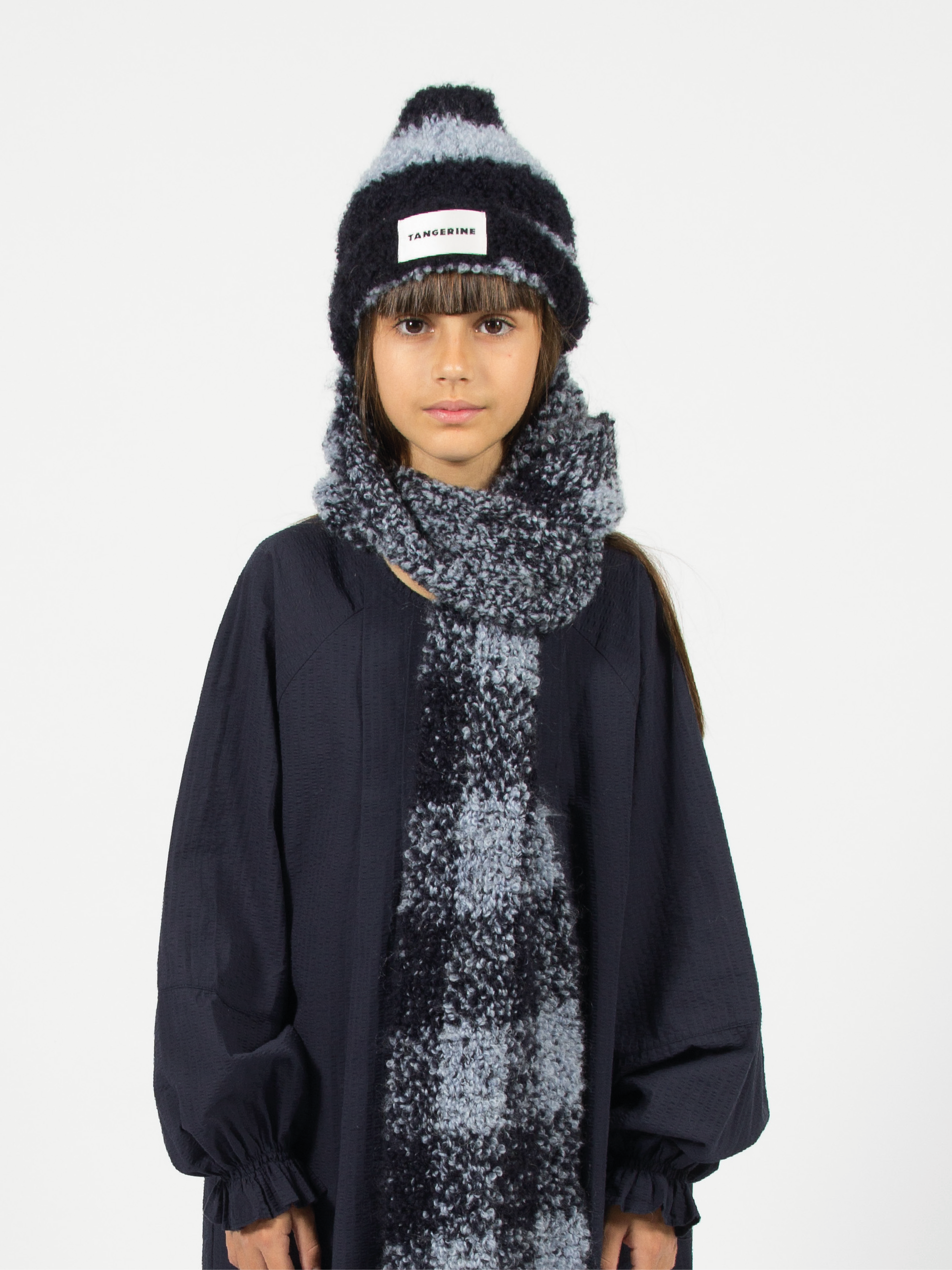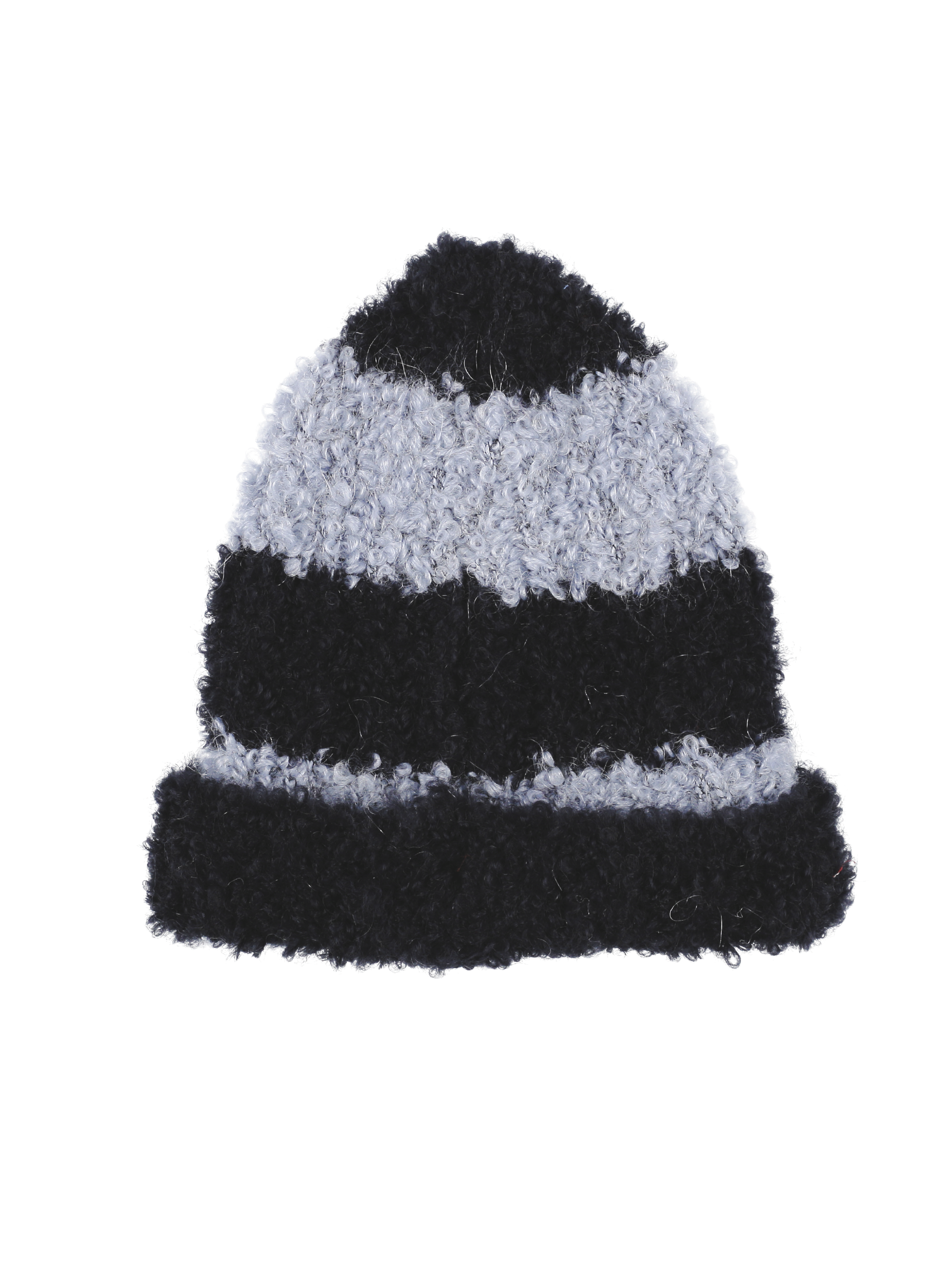 Chunky beanie with stripes. Crafted from mohair blend. Stitched Tangerine label on the front.