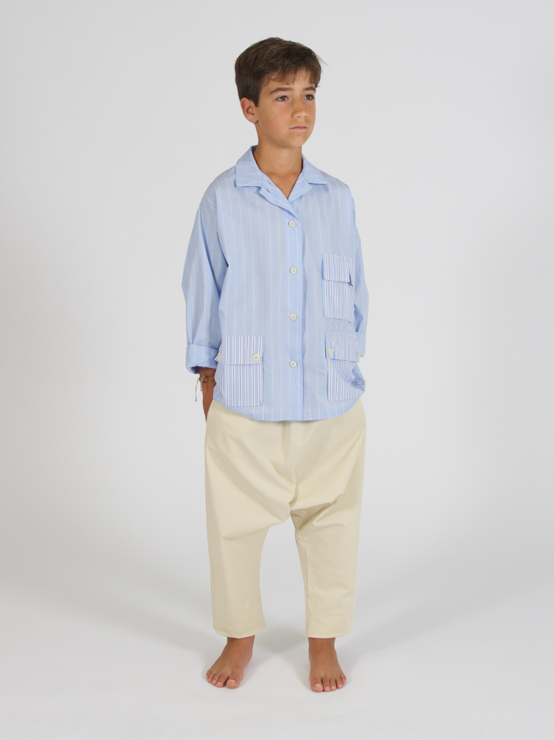 Long sleeved overshirt made from cotton styled with boxy fit and button closure, two side pocketsand one chest pocket in contrasting stripes.