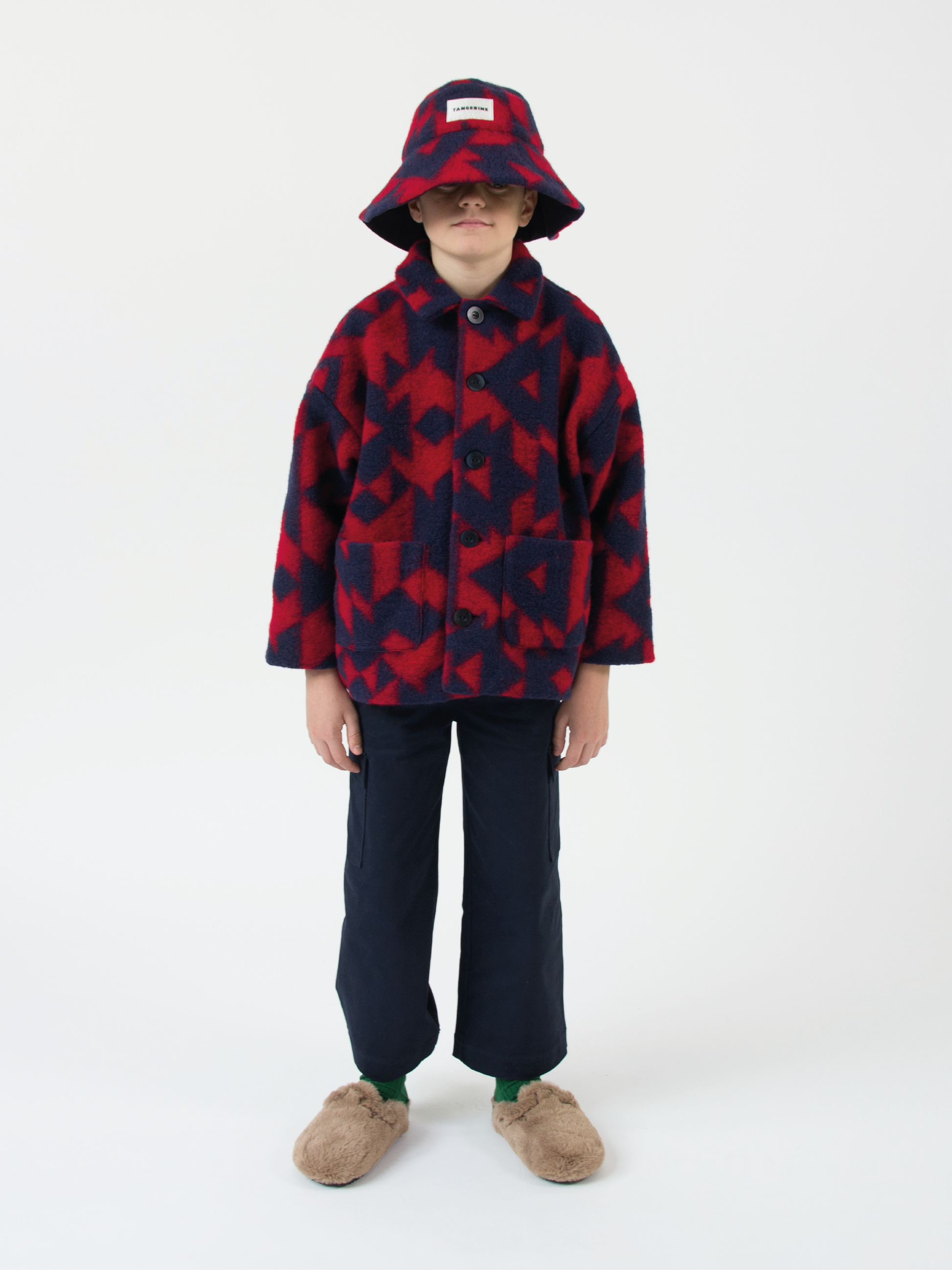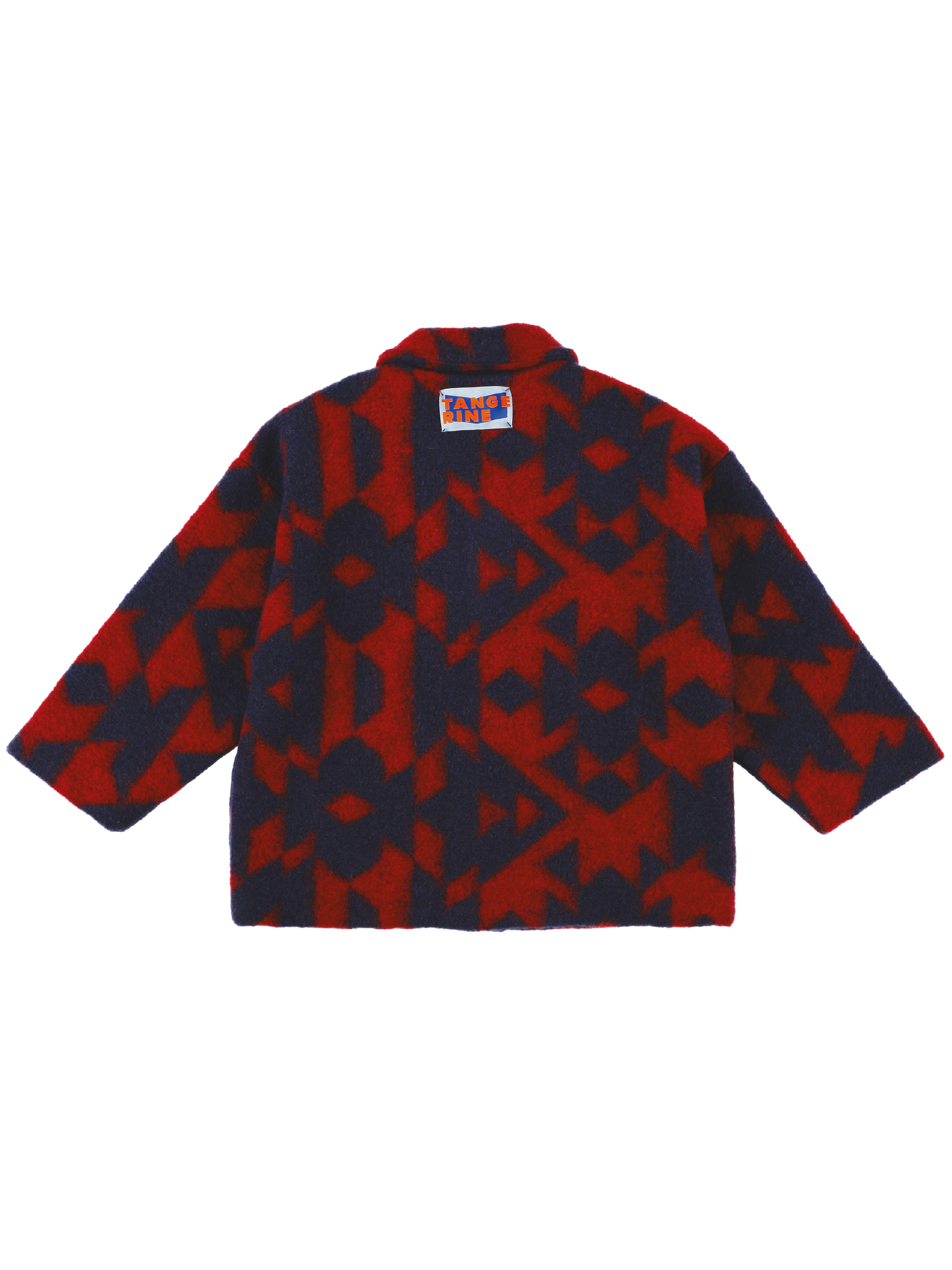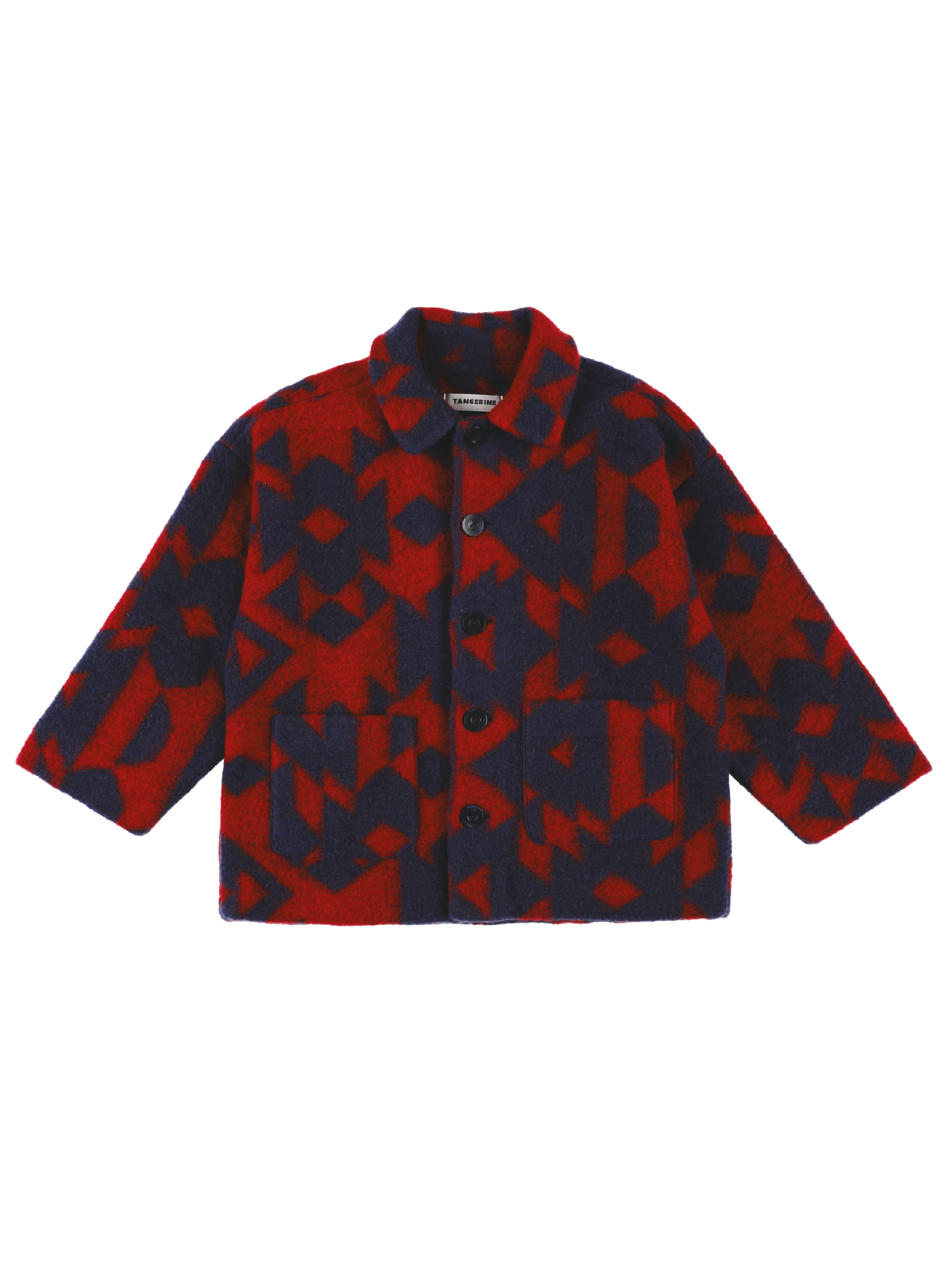 Oversized wool jacket with classic collar, single breast closure and two patch pockets. Lines with interior pocket and stitched Tangerine label on the back.