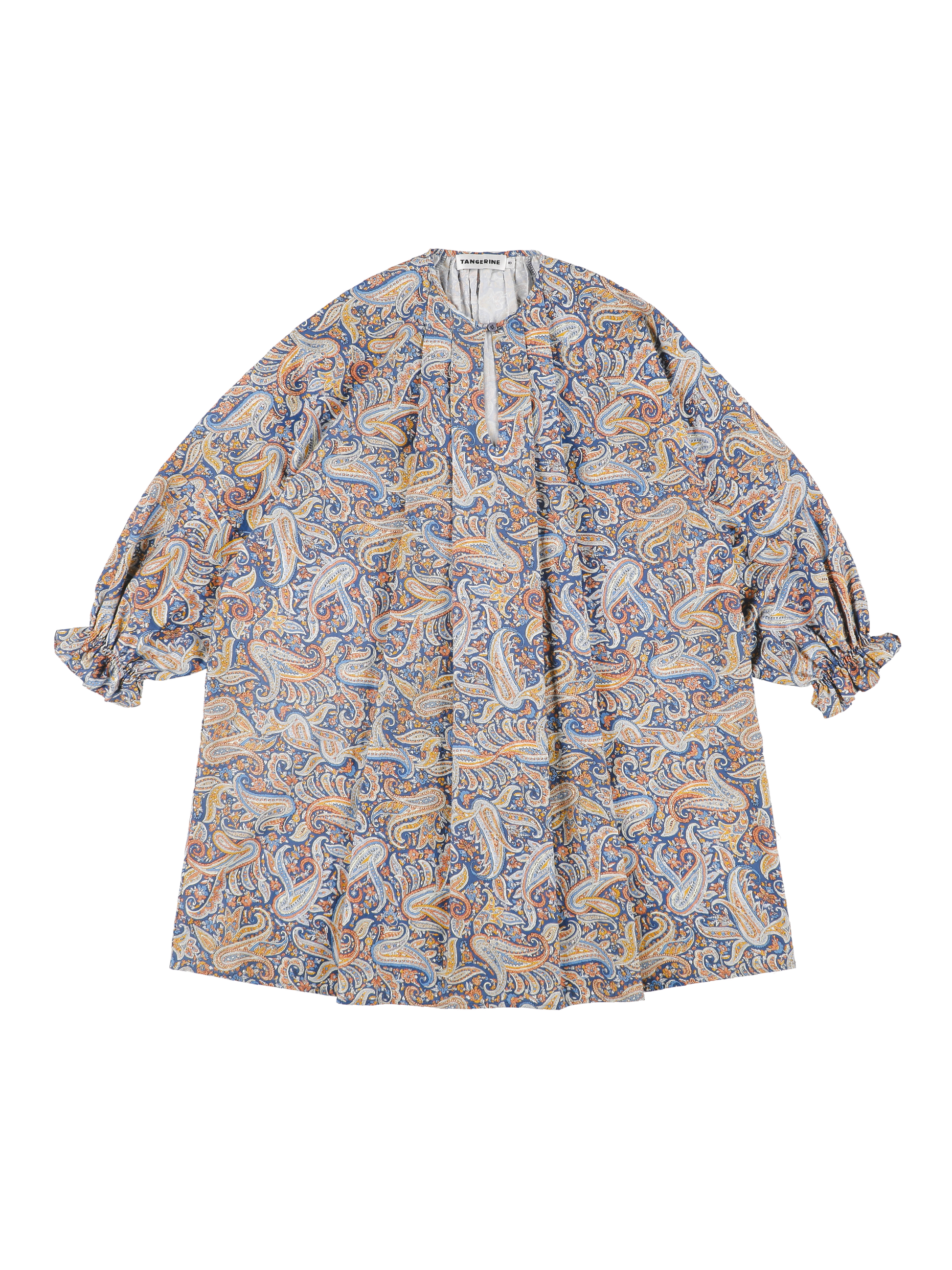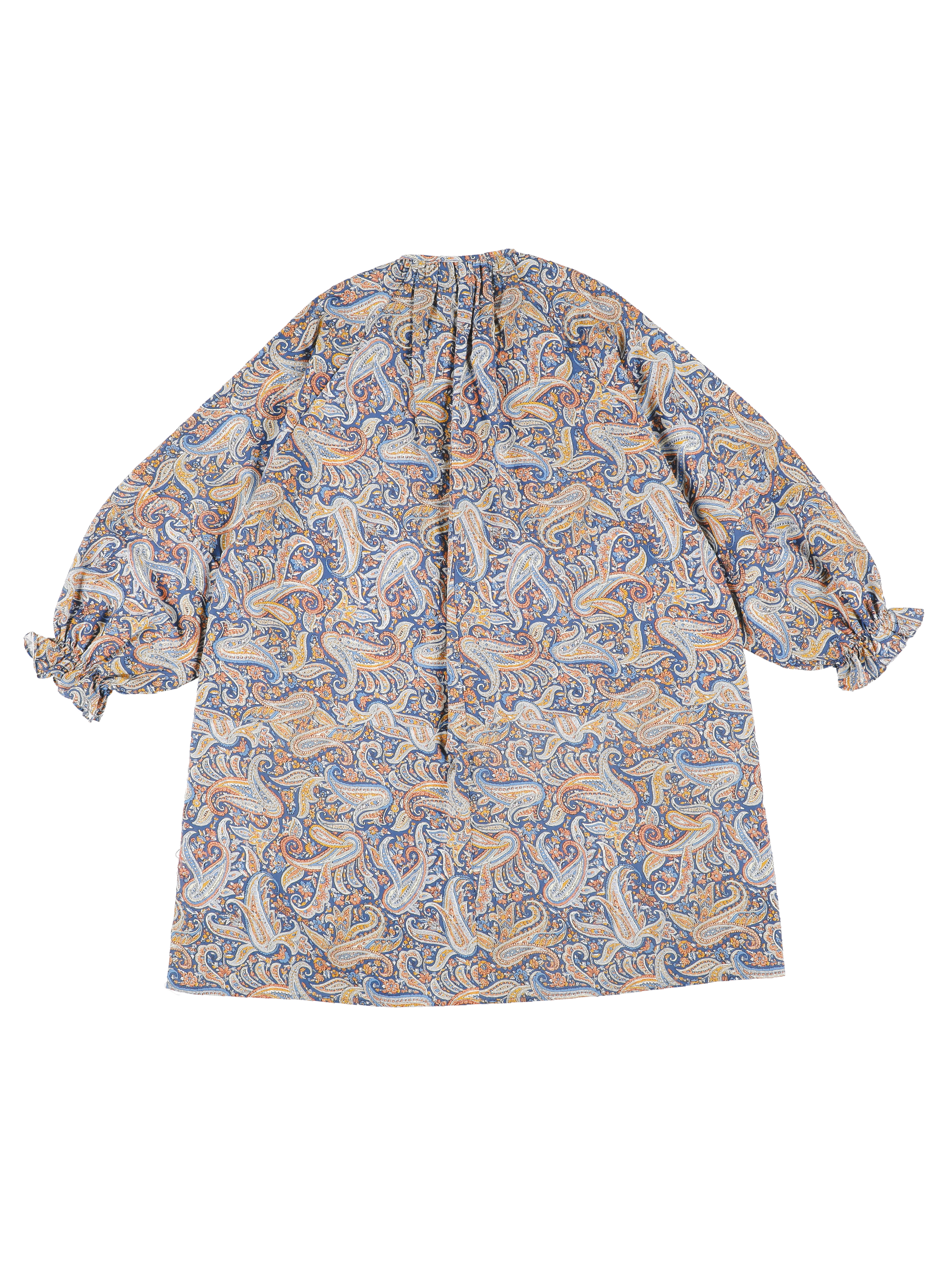 Pasley motif dress, pleated neckline and sleeves with wide volume and tightened elasticated cuffs. Neckline with one front button closure. Lined.