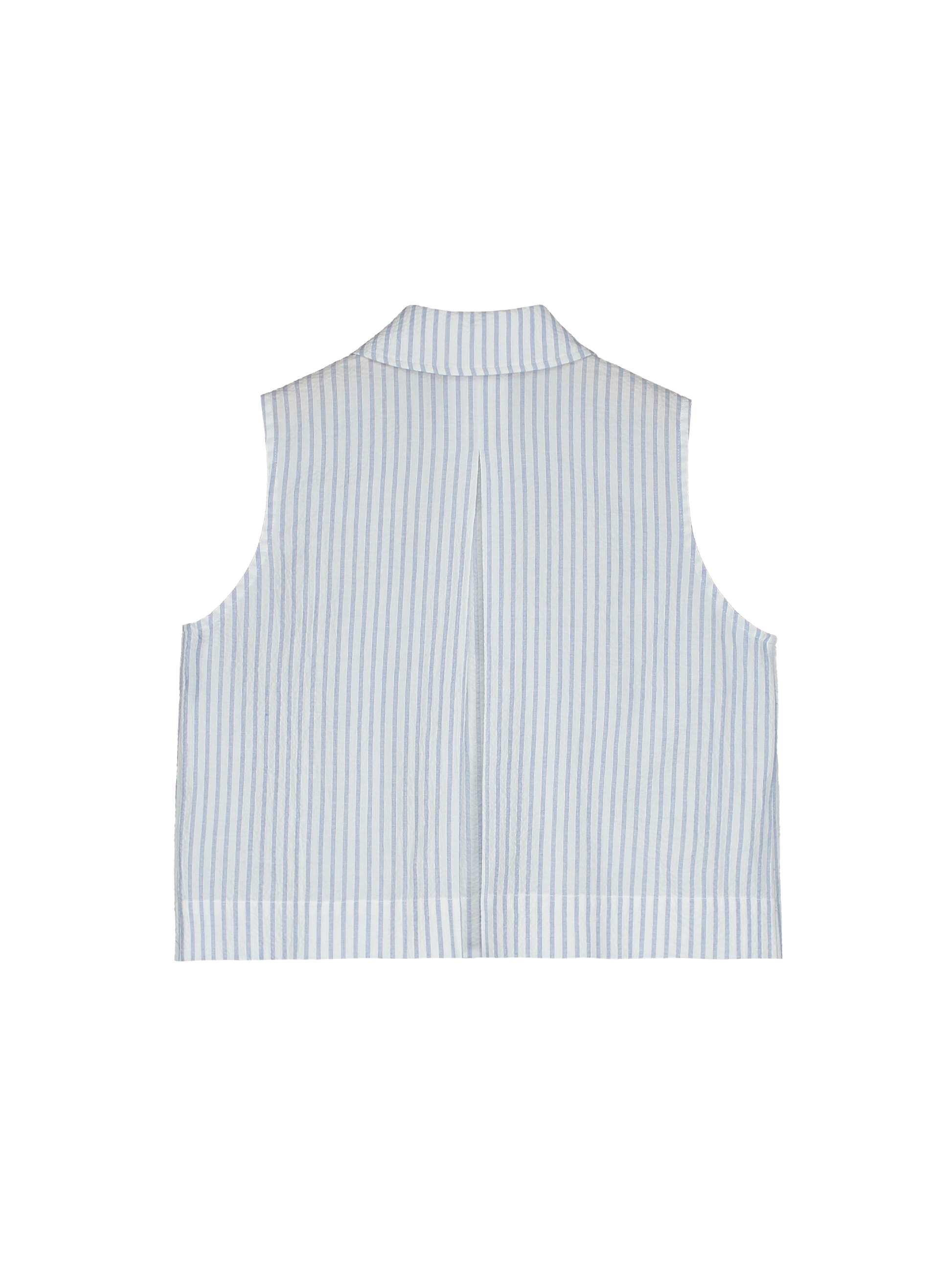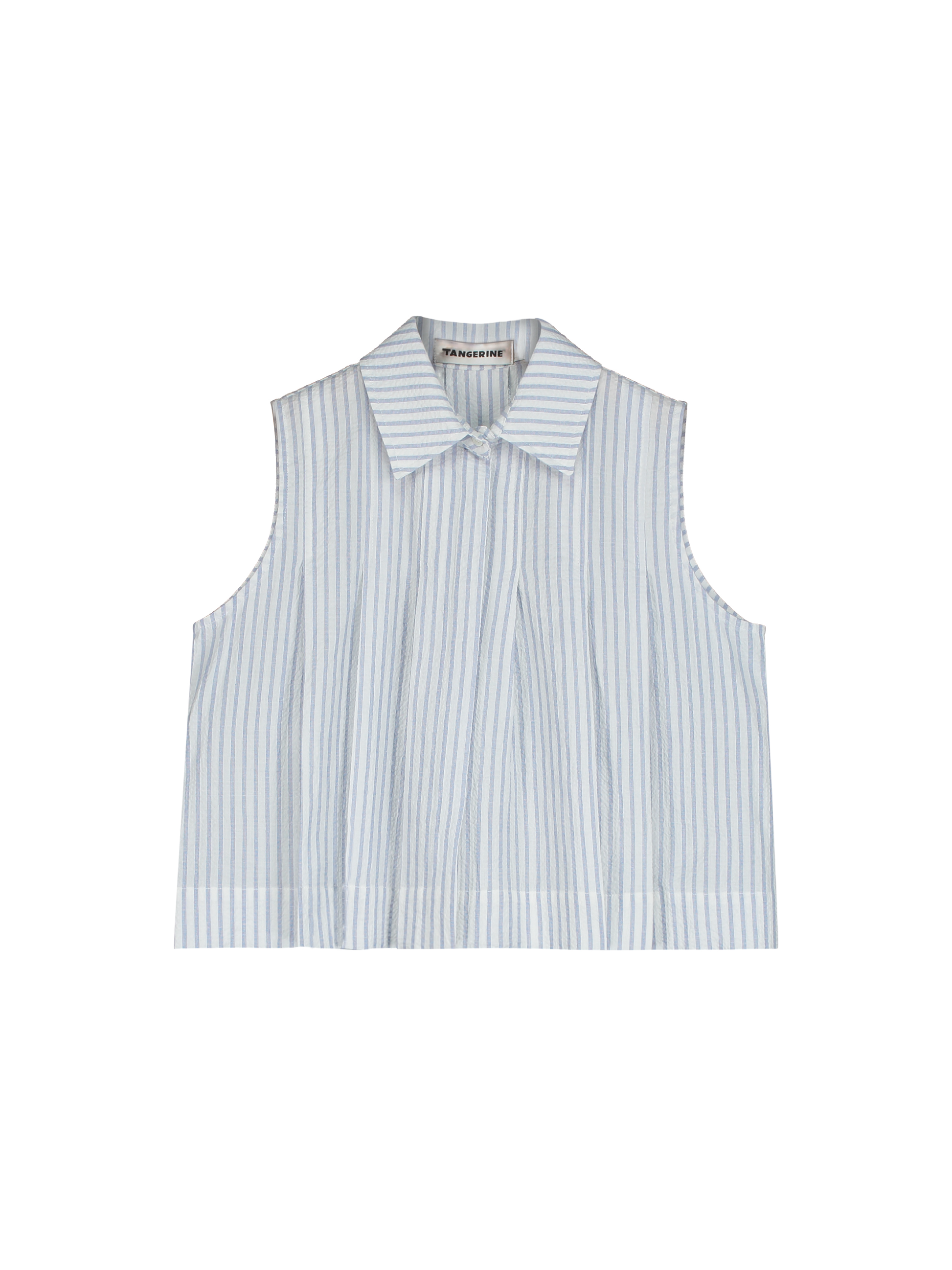 Pleated blouse made from seersucker, styled with a classic collar and front button fastening.