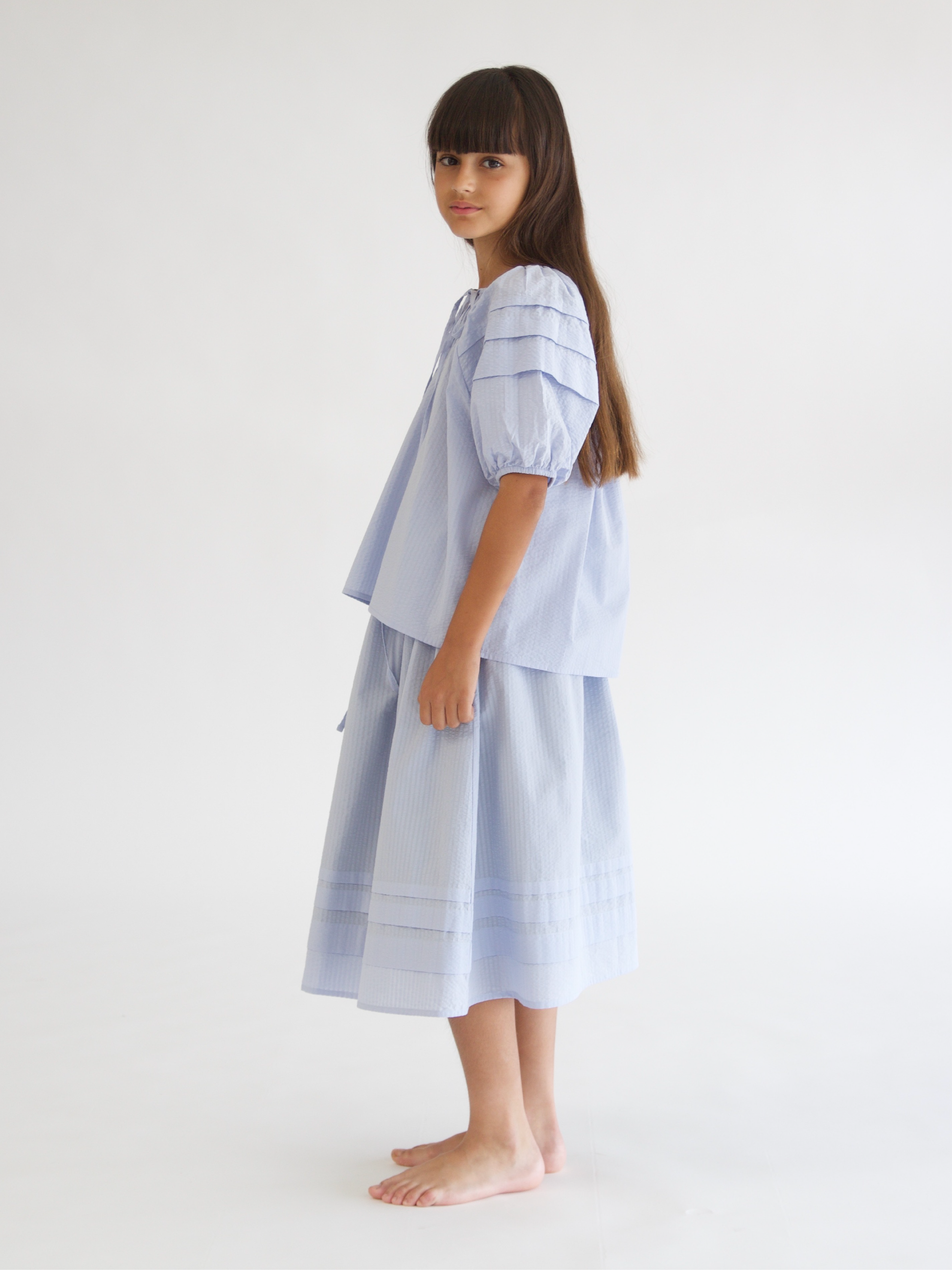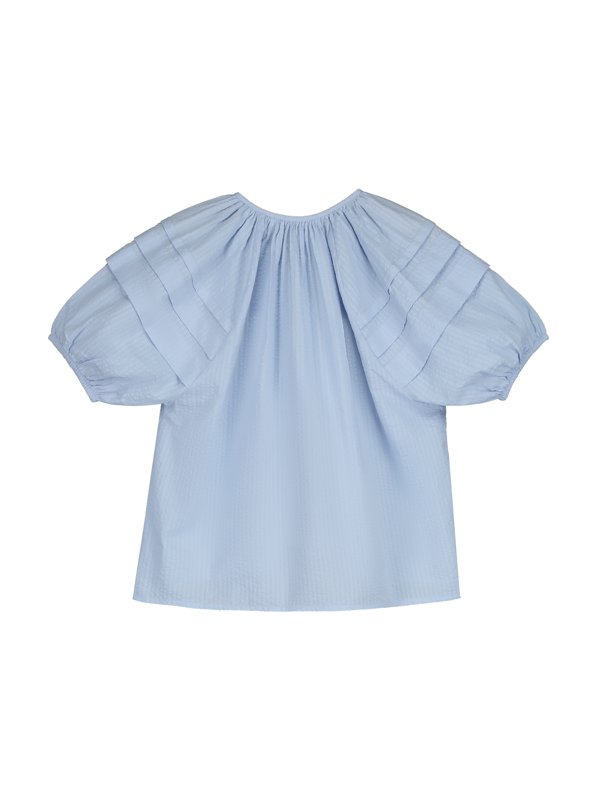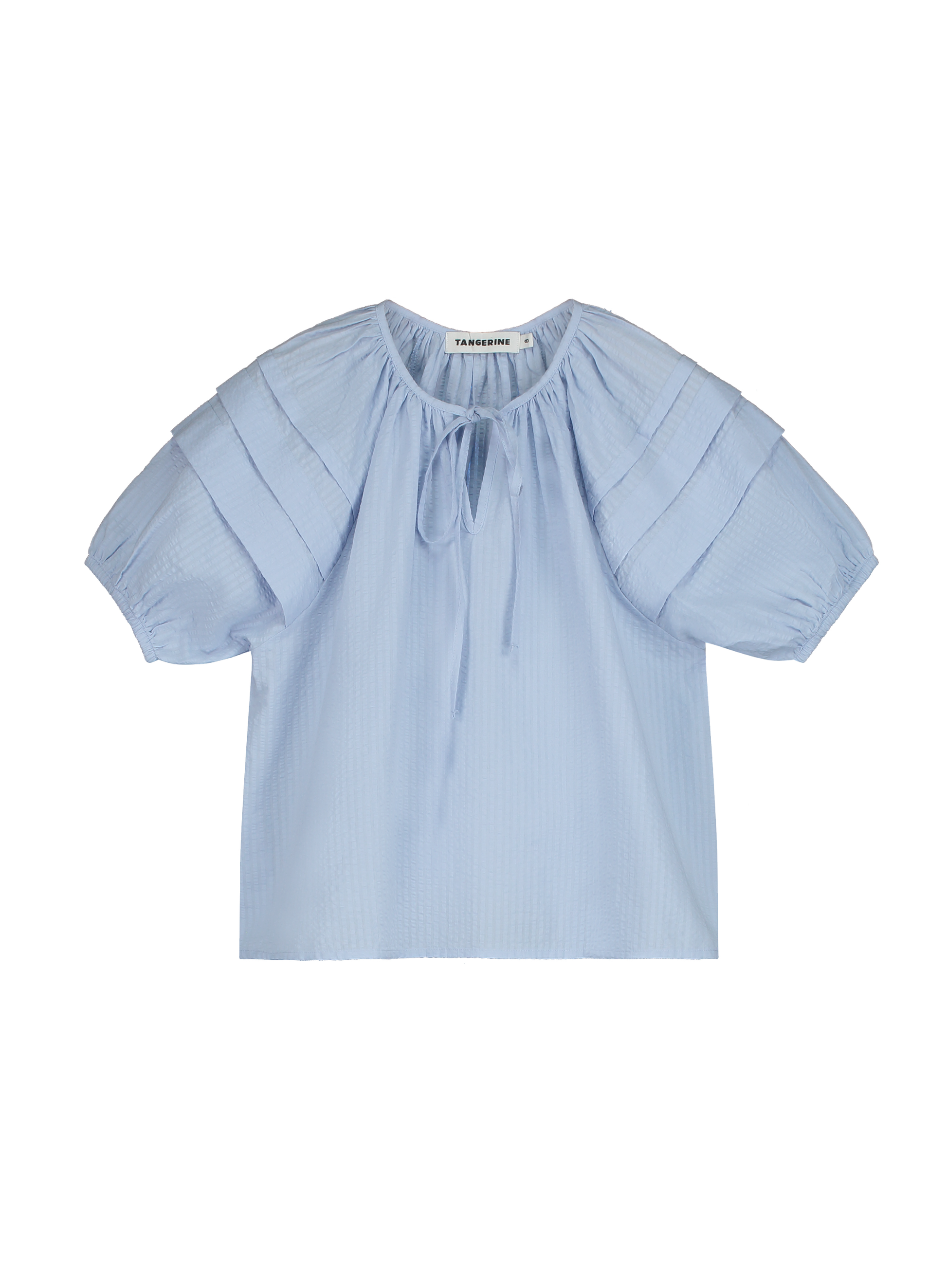 Blouse made from seersucker styled with a regular fit, puffed sleeves styled with pleats and around neck tiedon front.