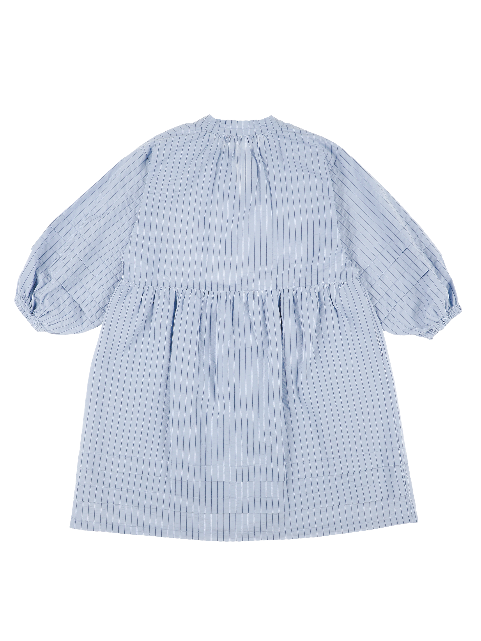 Garment-dyed. Seersucker dress with pleated long-sleeves and hem. Tied neckline closure and evasé fit. Lined.