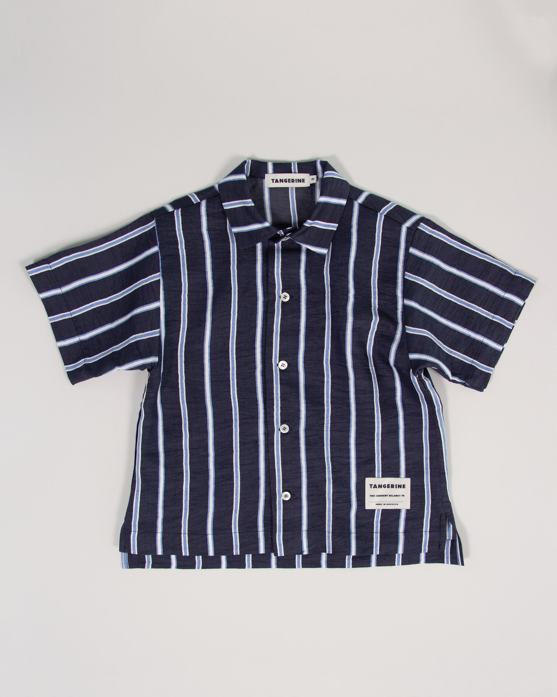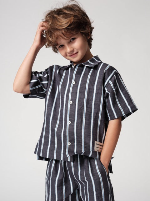 Short sleeve with regular fit in navy and baby blue stripes buttoned on the front.