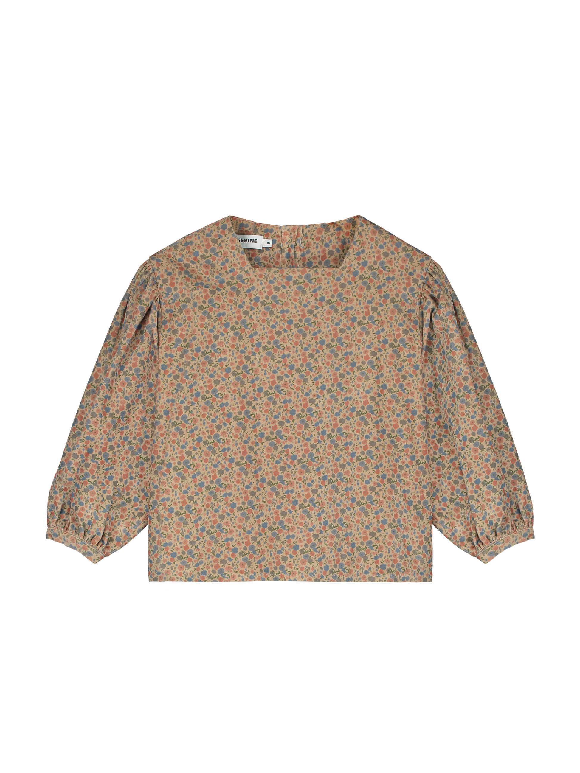 Square neck blouse made from corduroy embellished with this season print styled with voluminous sleeves. Relaxed fit with symmetrical cuts. Back button closure and button cuffs. Weave-dyed.
