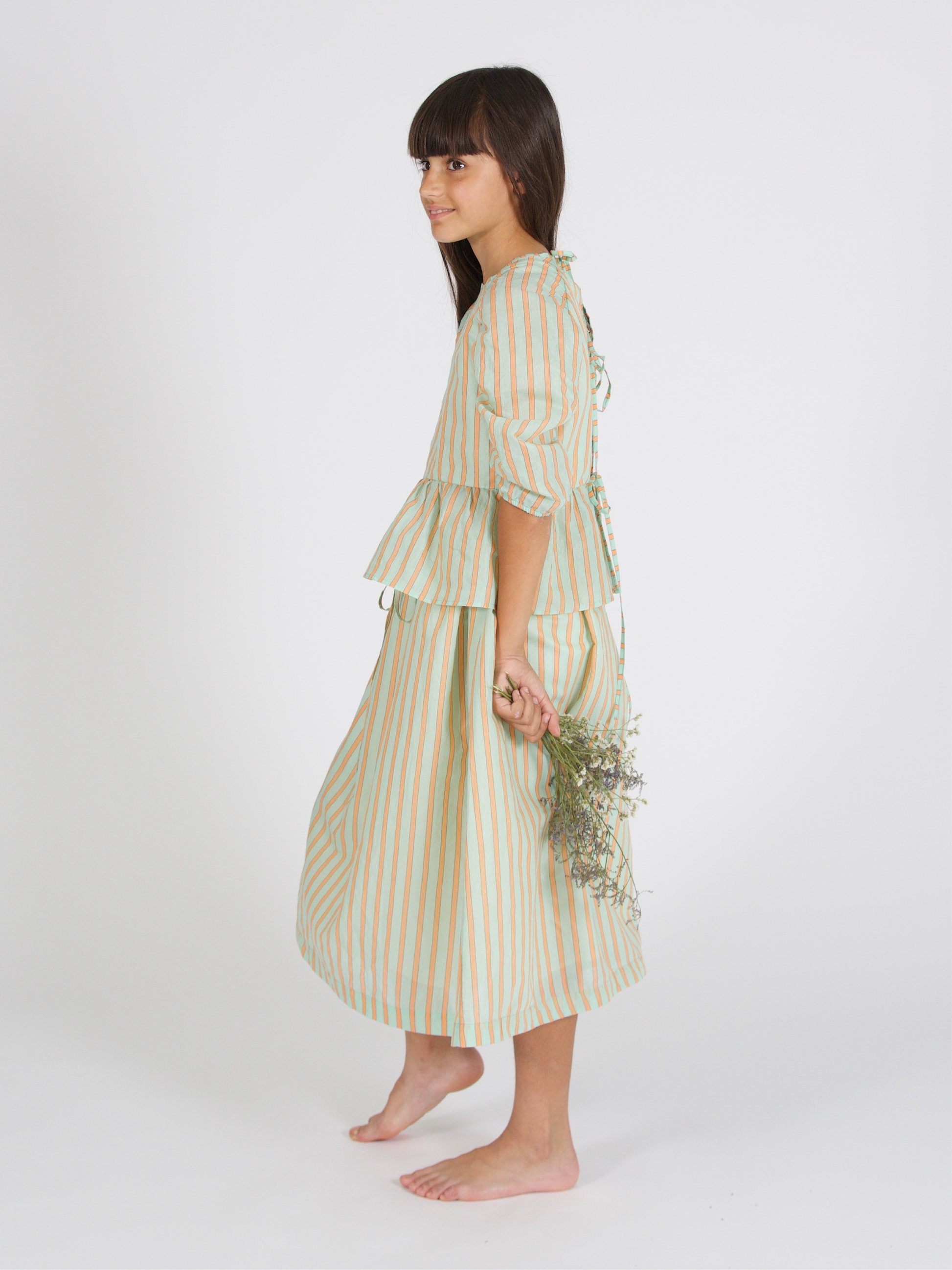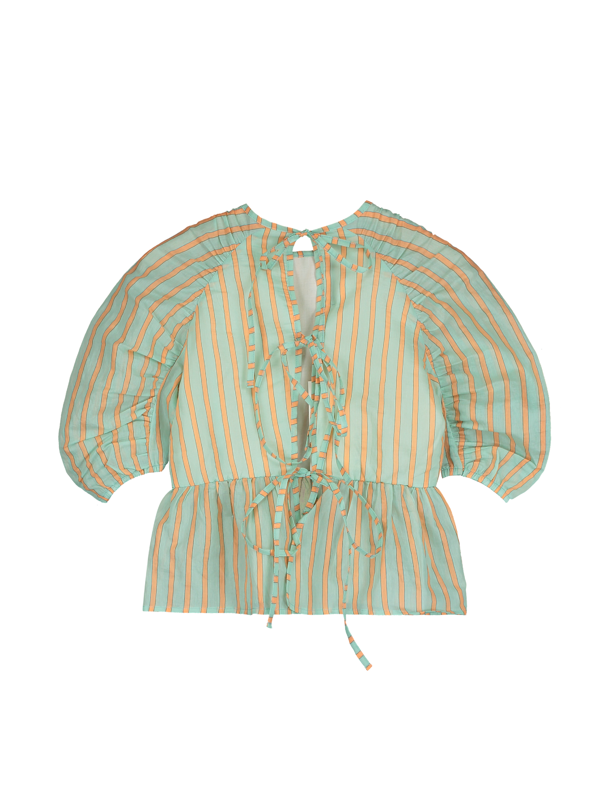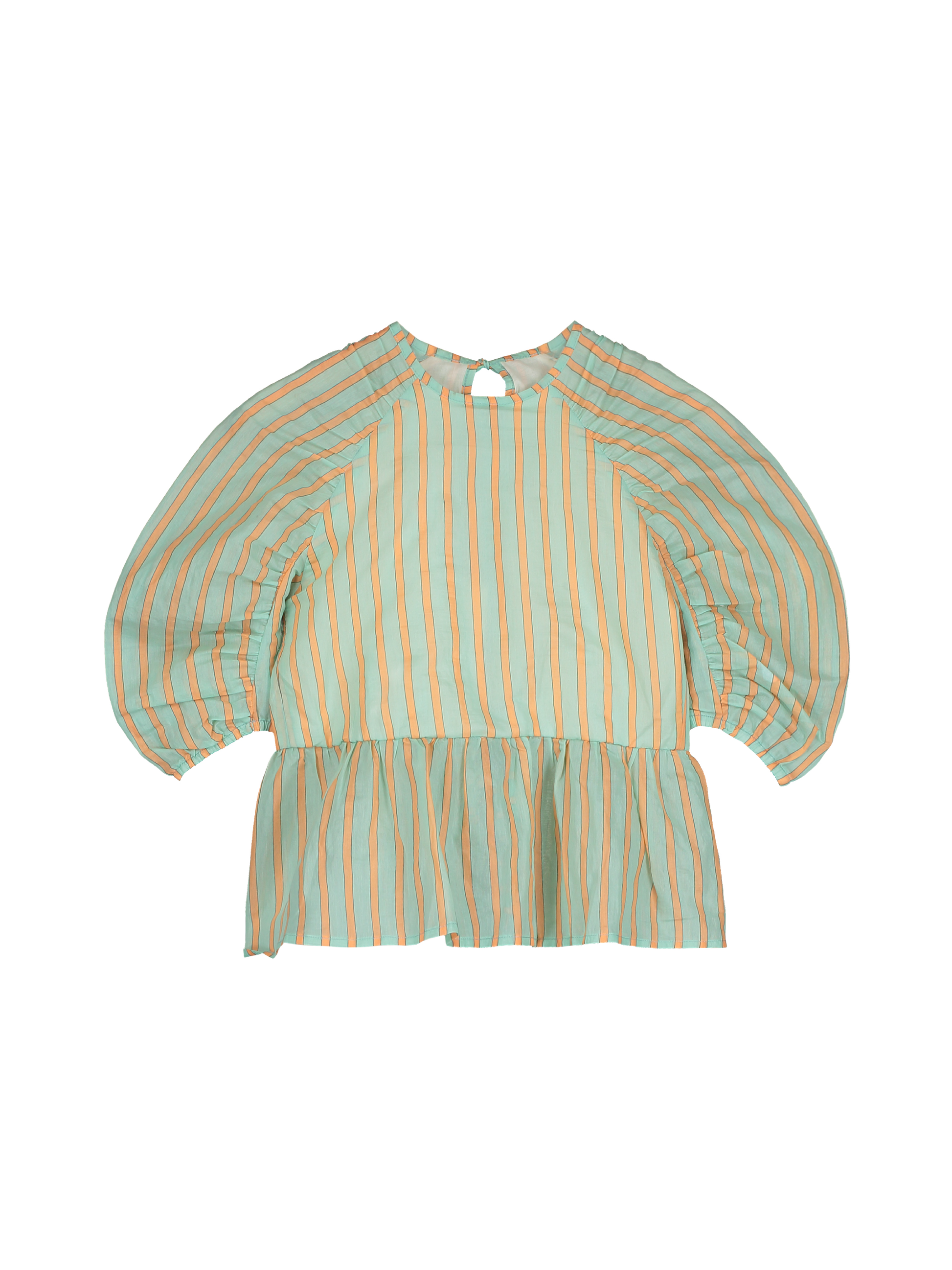 Regular fit striped peplum blouse, styled with ruffled sleeves and a round neckline. Back tied closure. Lined.