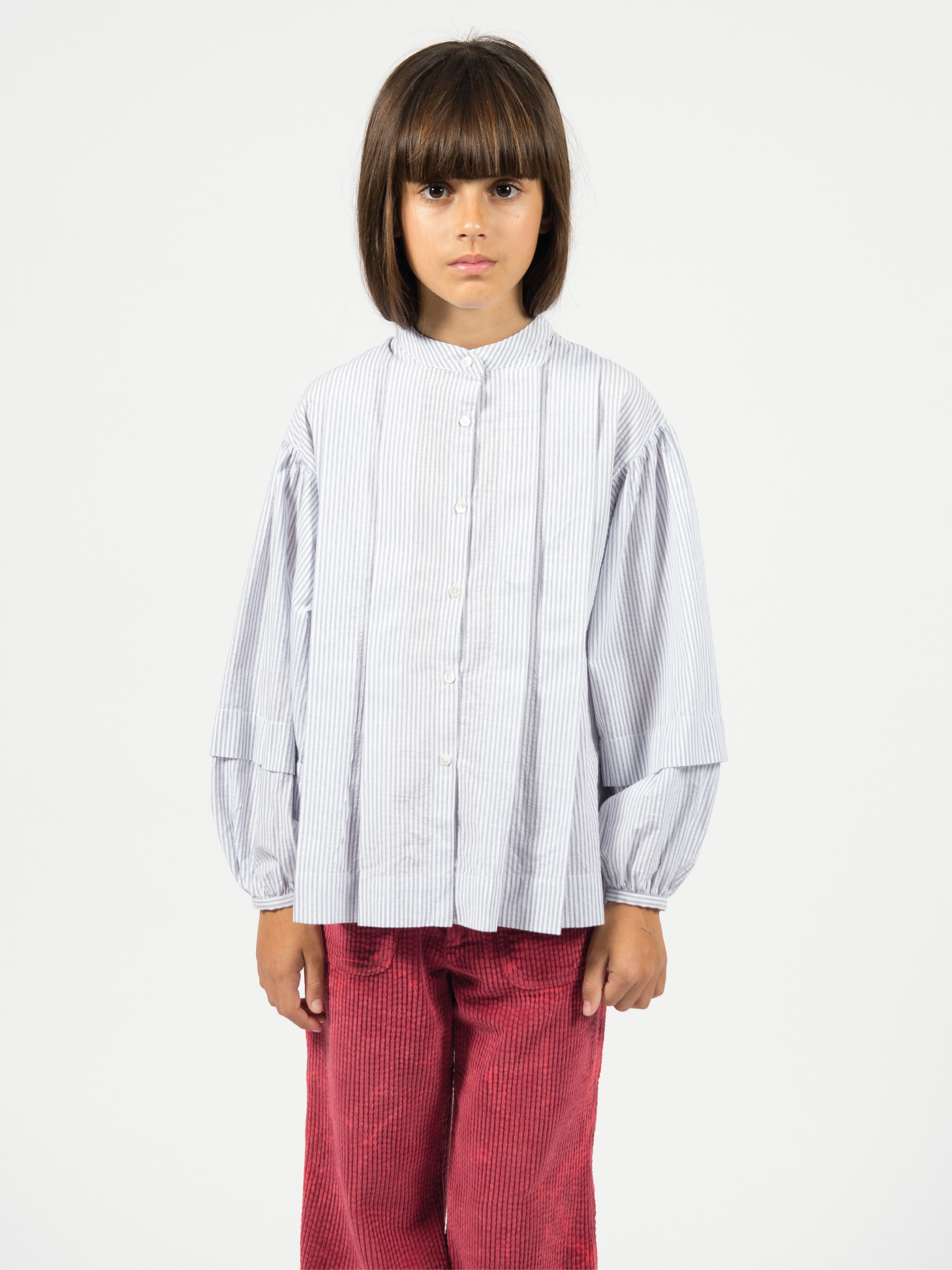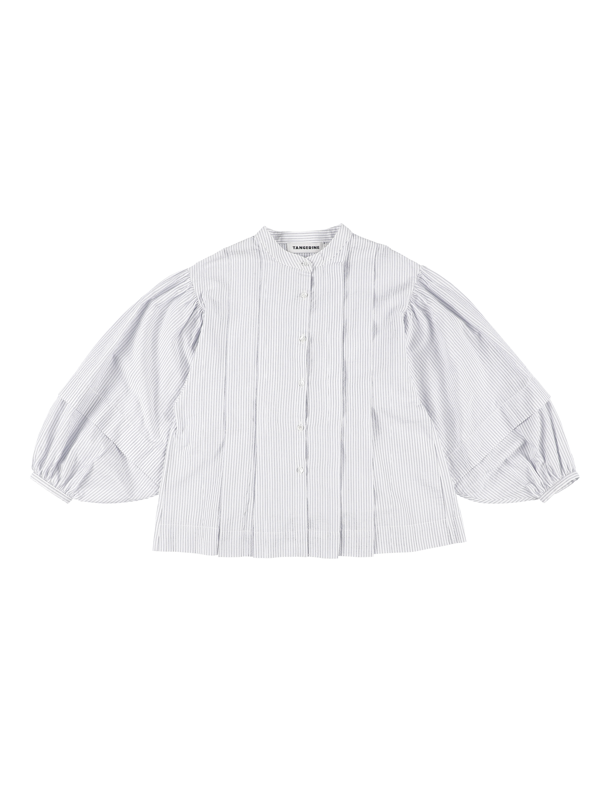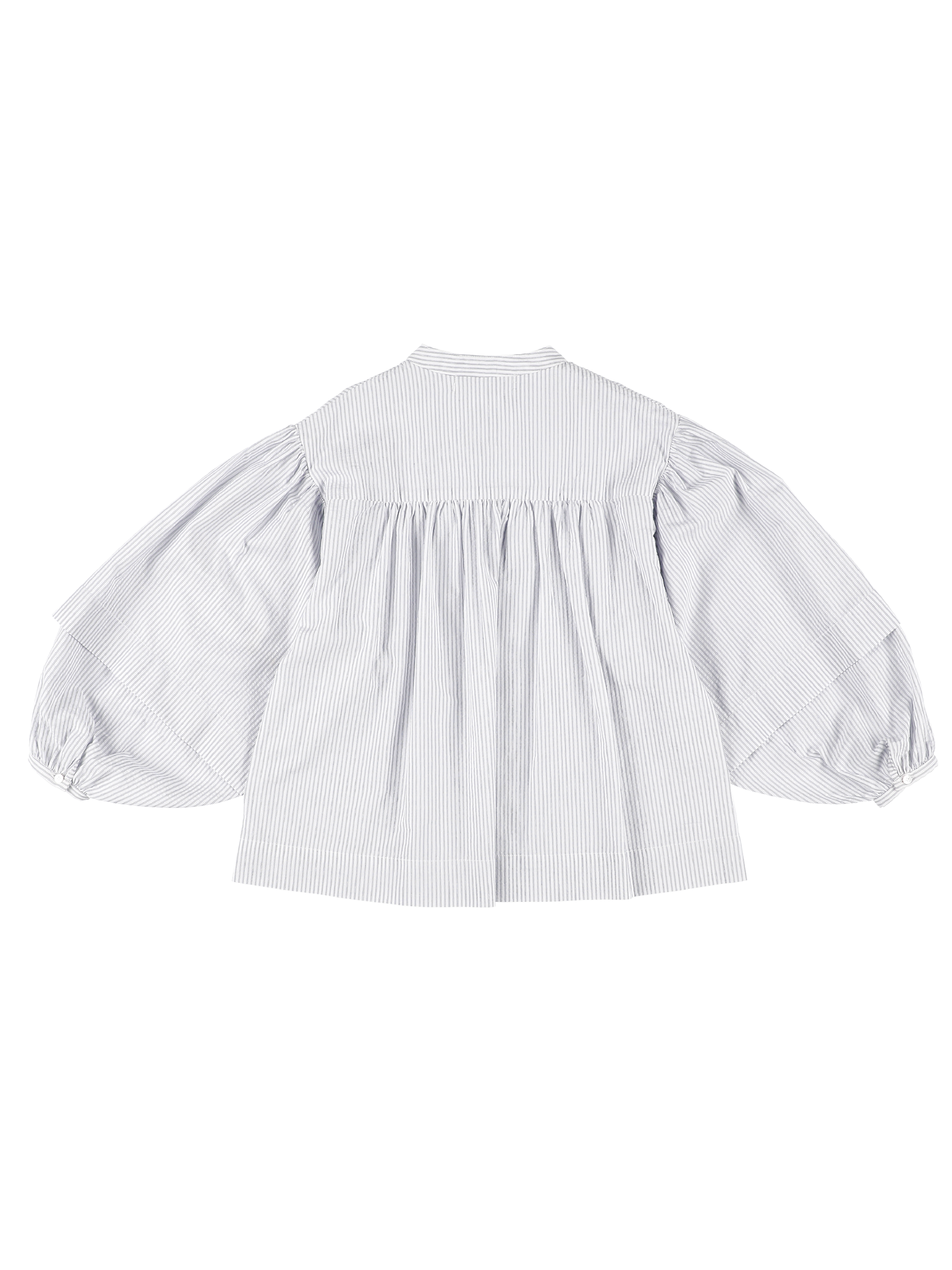 Seersucker evasé pleated blouse, round neckline with collar stand, long voluminous sleeves pleated with cuffs.