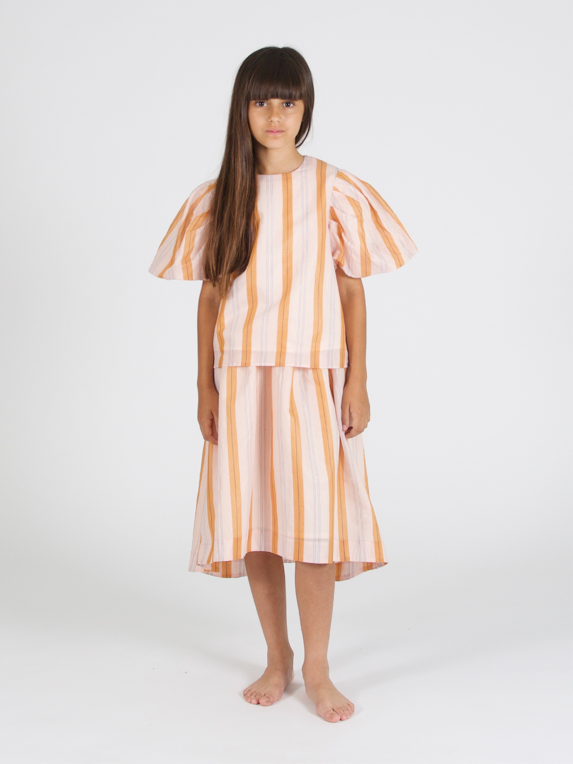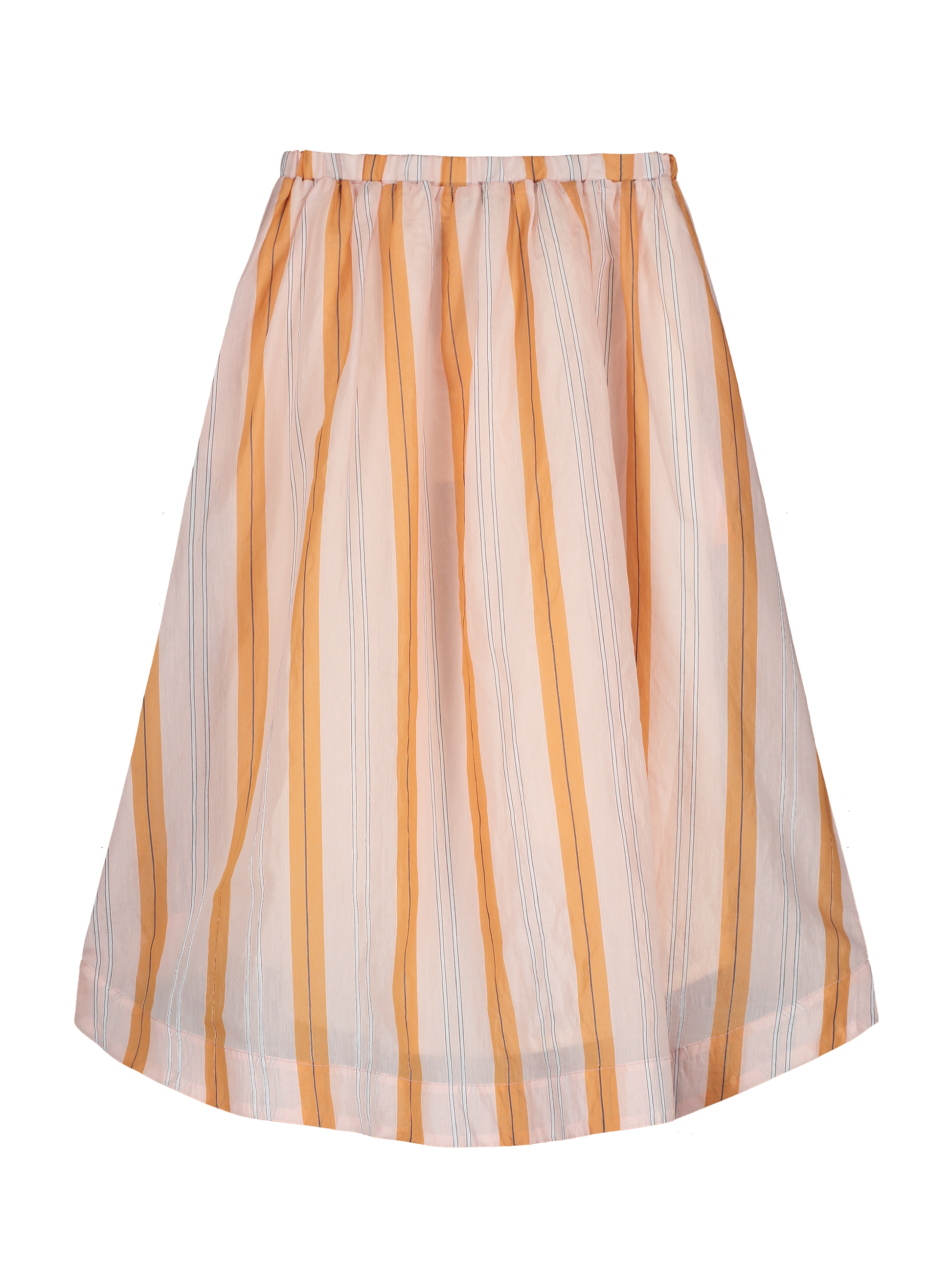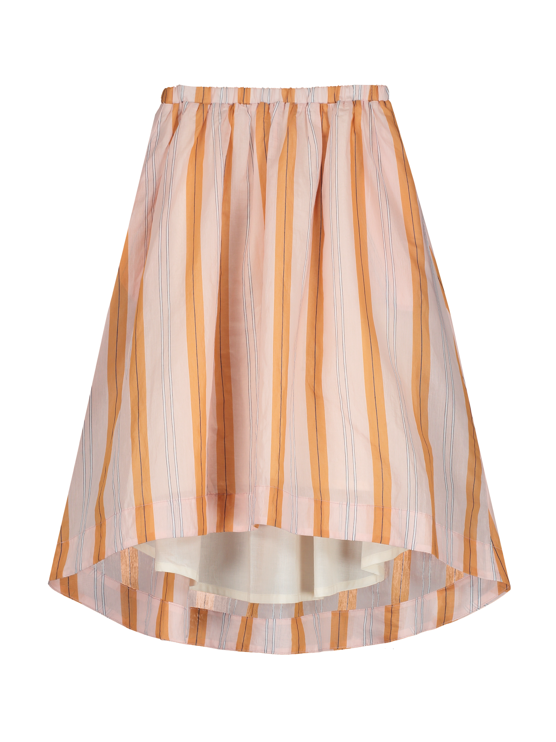 Asymetrical midi skirt made from strined cotton blend stvled with an elasticated waistband and two side pockets. Lined.
