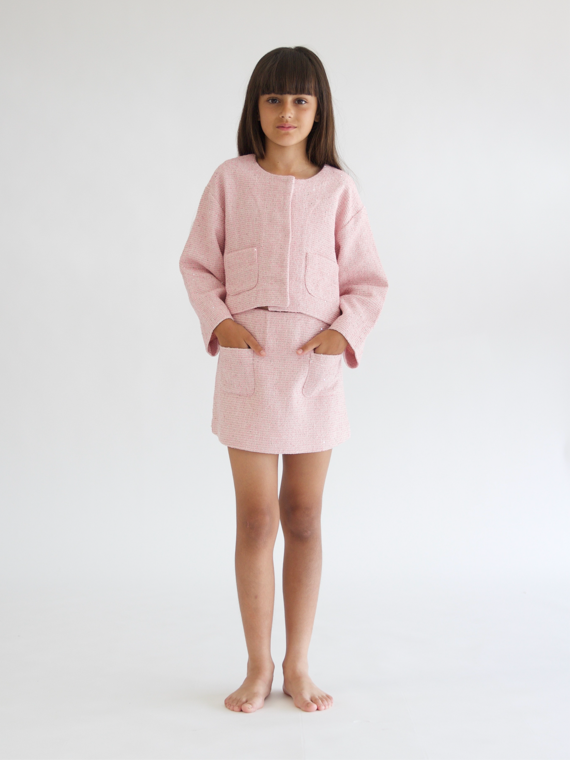 Boxy fit - short jacket made from tweed, styled with a frontal closure with two side pockets.