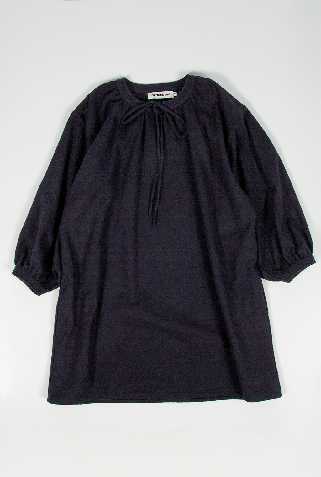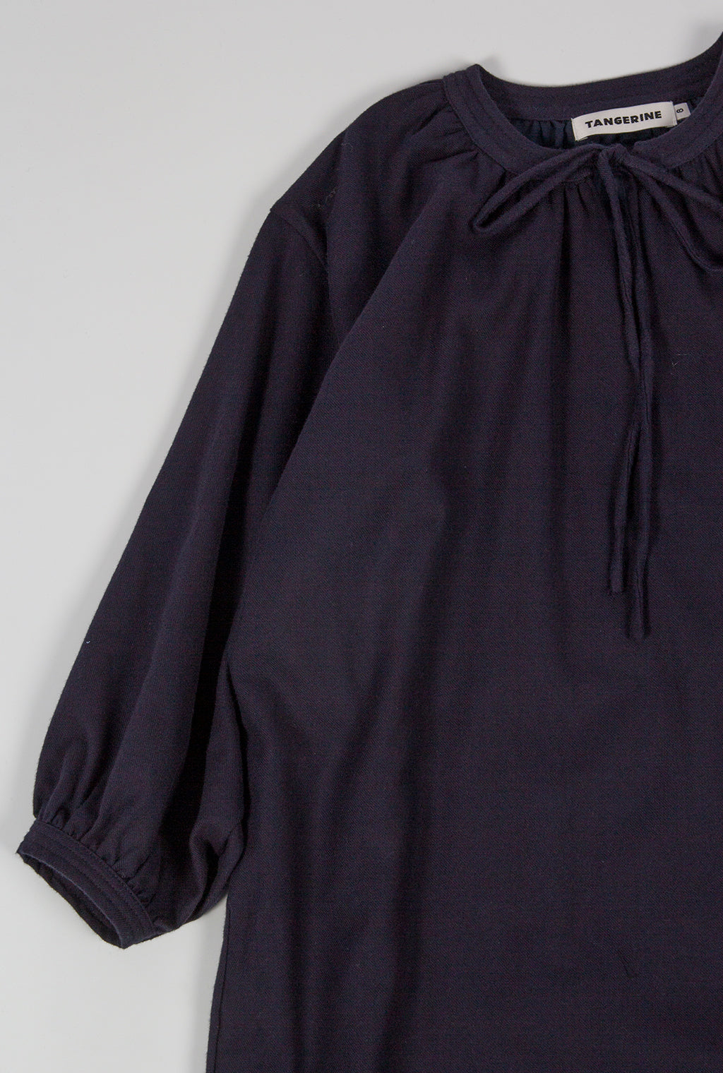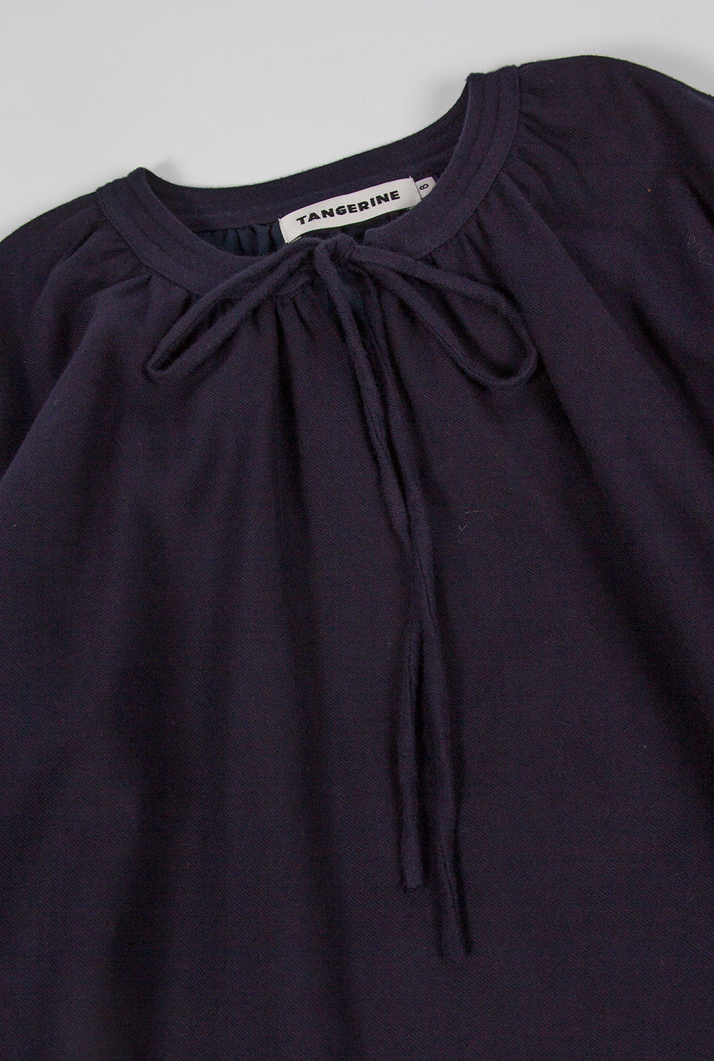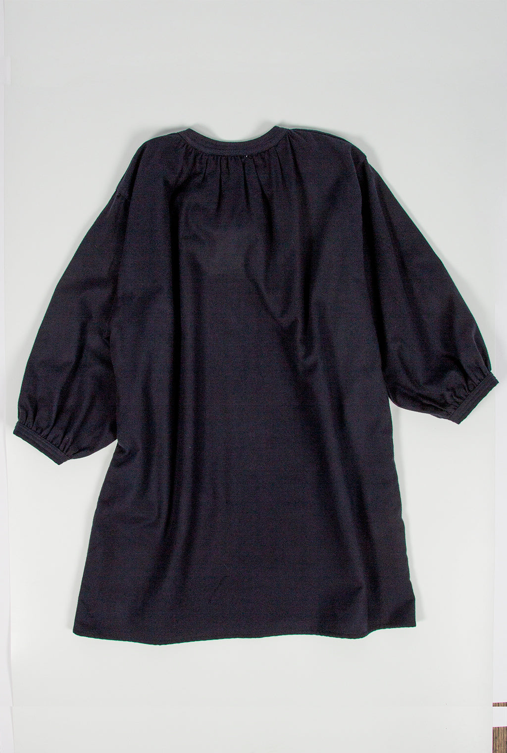 Oversize dress with volumed sleeve made with twill, tied at neck and lined with voile fabric.