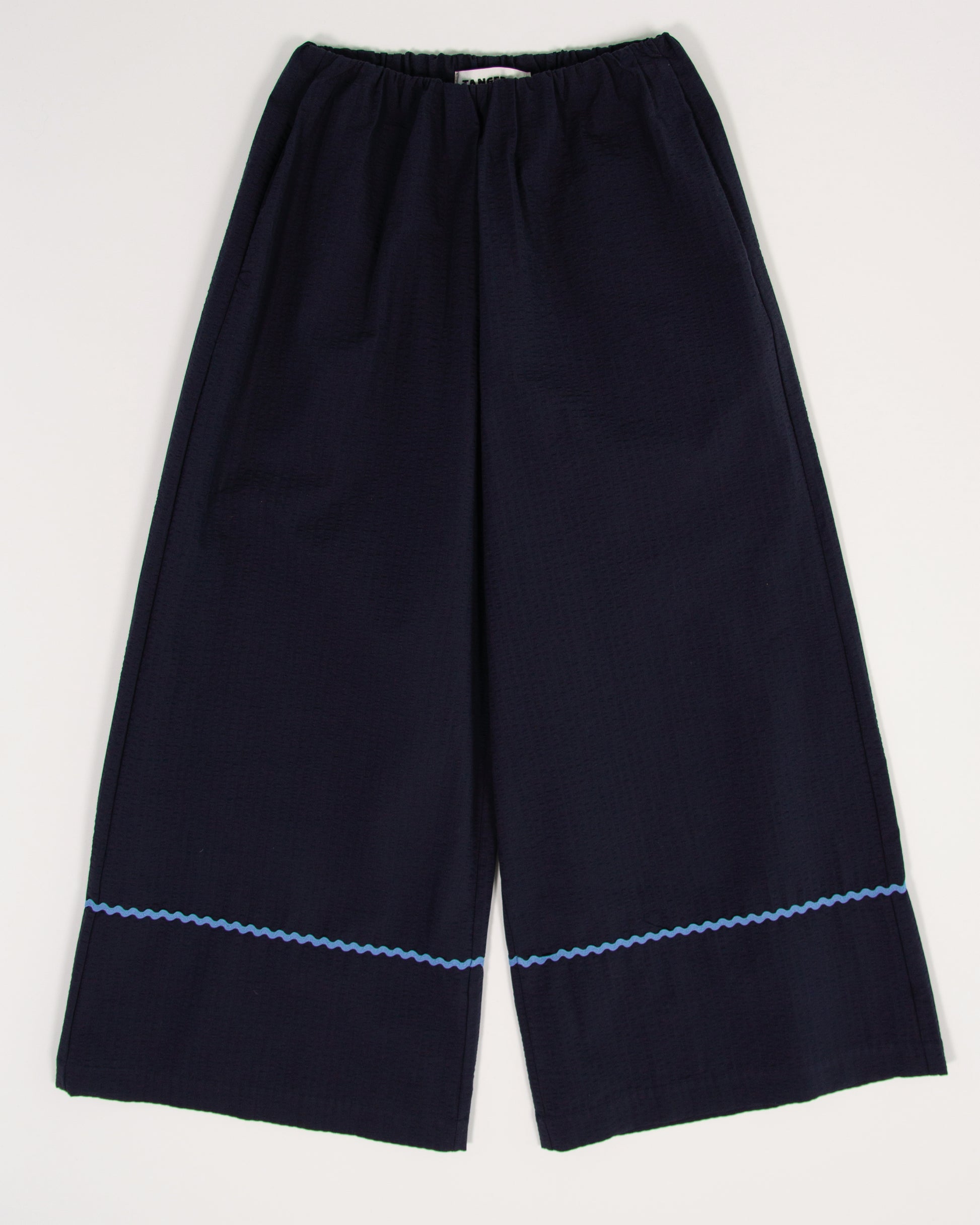 Wide fit trousers with inseam pockets, elastic waistband and ribbon detail.